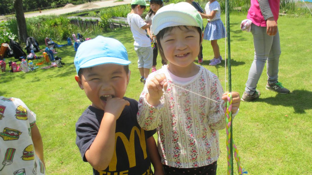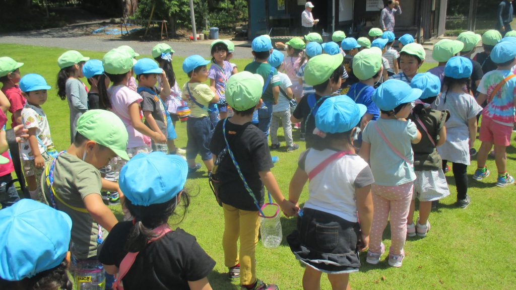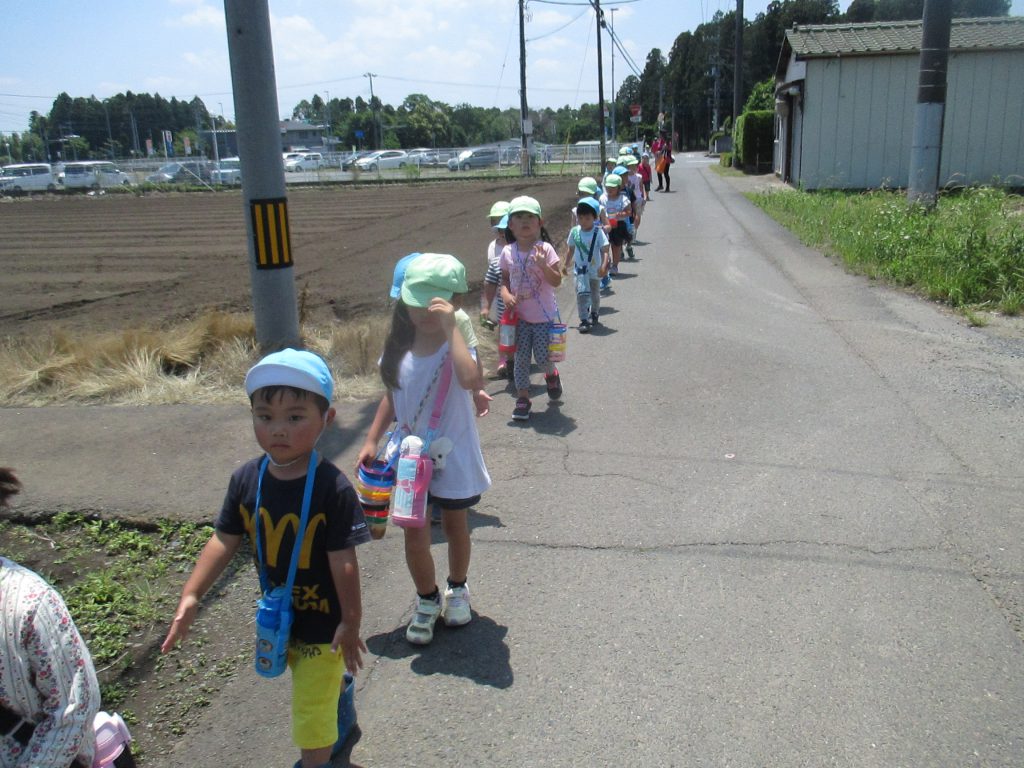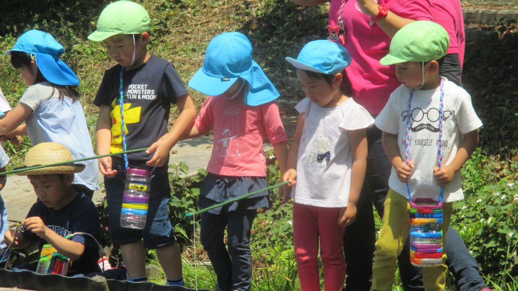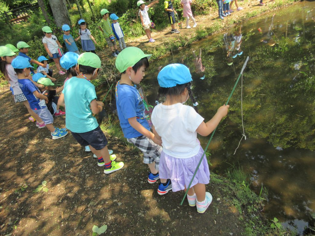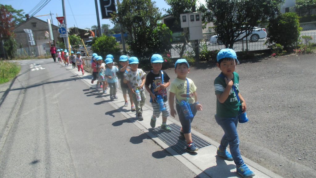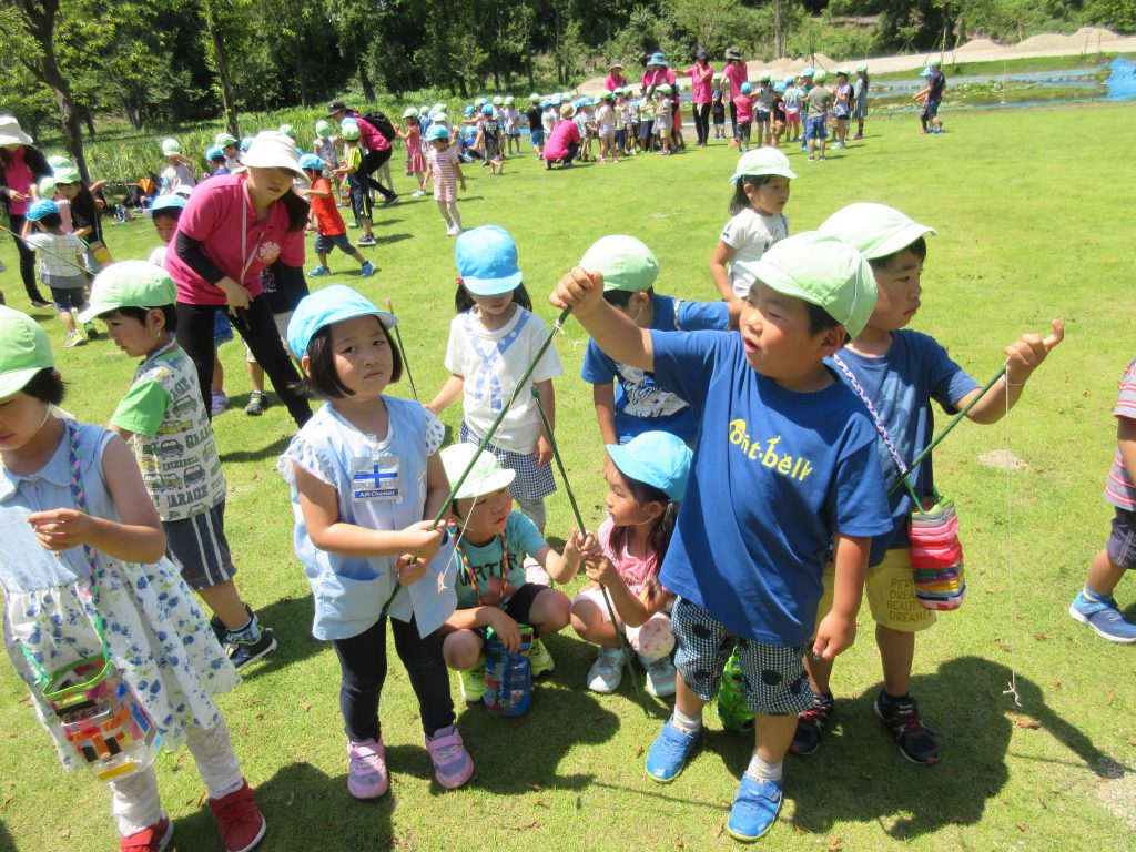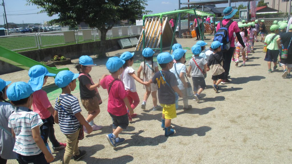 清水洞の上公園へザリガニ釣りに出発です!6日に清水洞の上公園に行った際に年長組のお兄さん・お姉さんがザリガニ釣りをしているのを見て,「私たちもやってみたい!」と年中組の子どもたちが伝えると,「一緒に行こう!」と誘いにきてくれました。