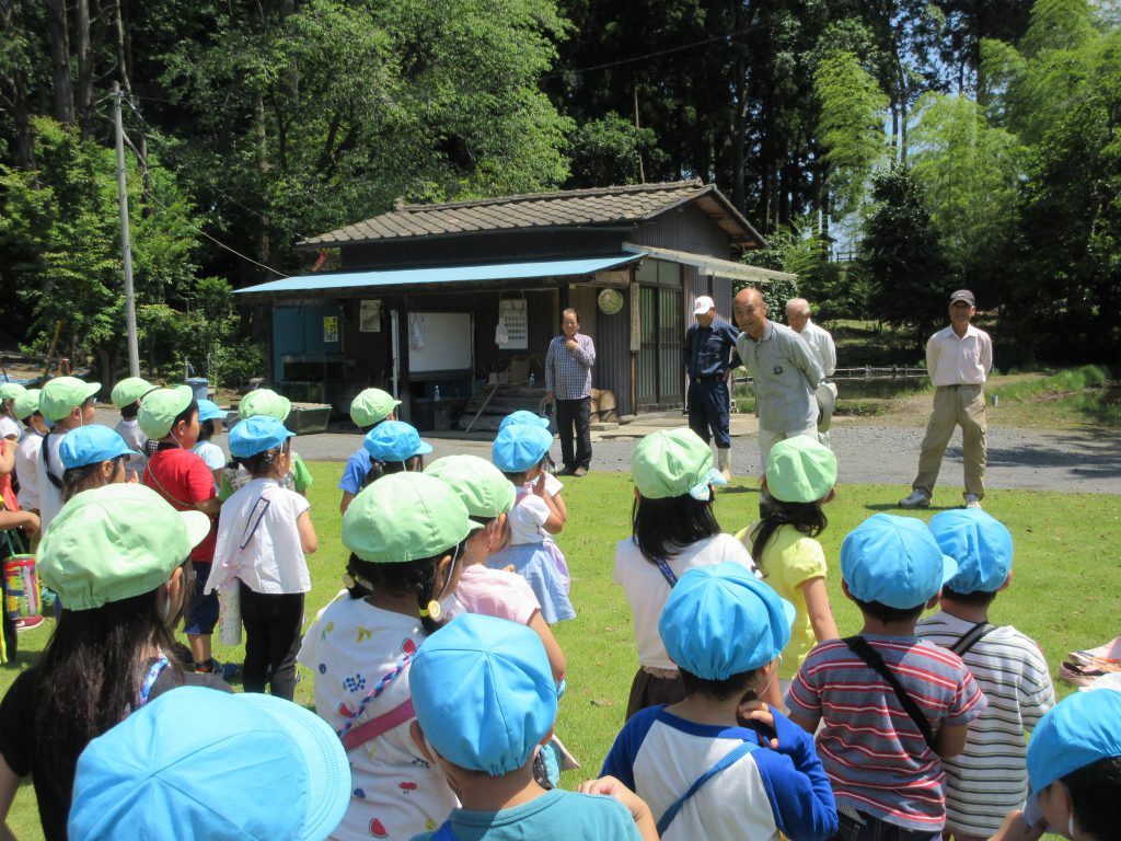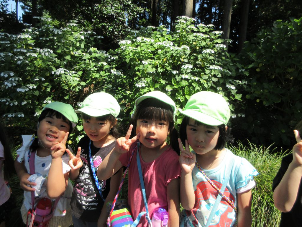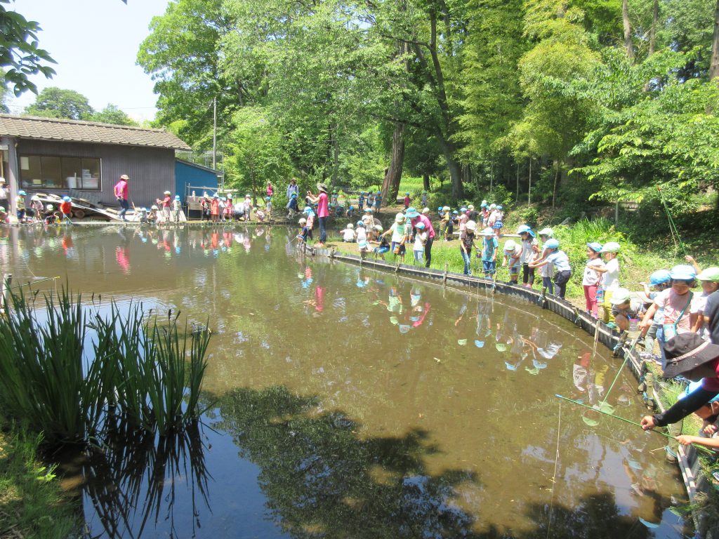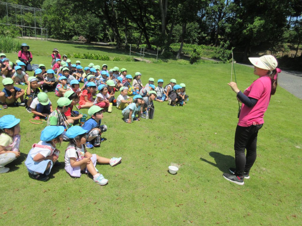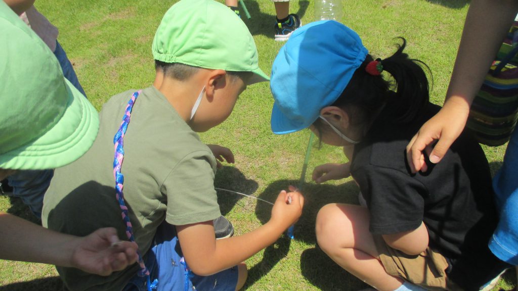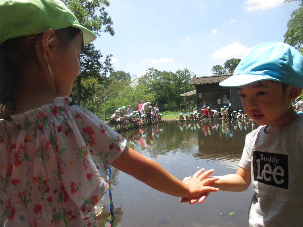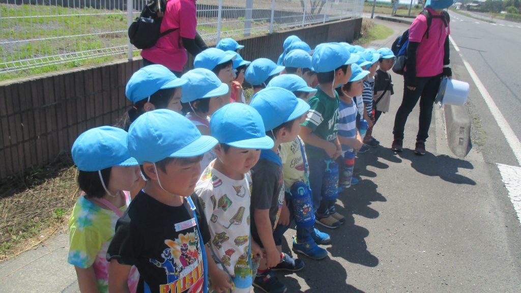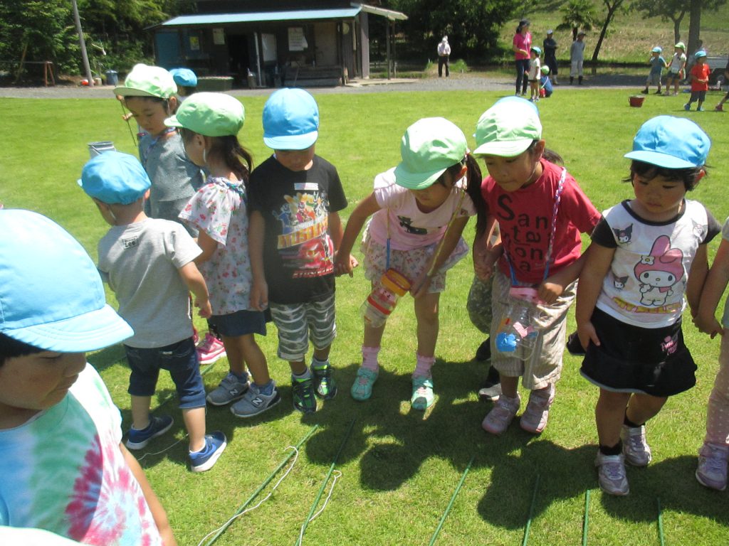 清水洞の上公園へザリガニ釣りに出発です!6日に清水洞の上公園に行った際に年長組のお兄さん・お姉さんがザリガニ釣りをしているのを見て,「私たちもやってみたい!」と年中組の子どもたちが伝えると,「一緒に行こう!」と誘いにきてくれました。