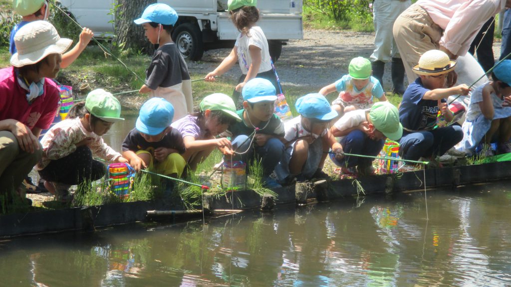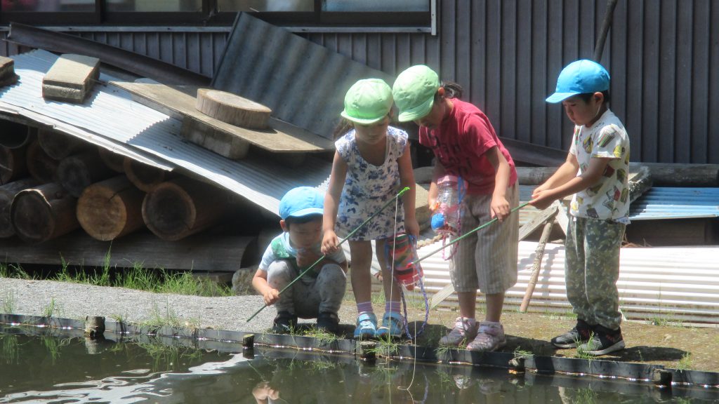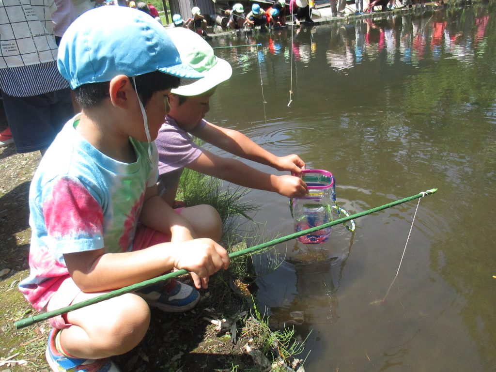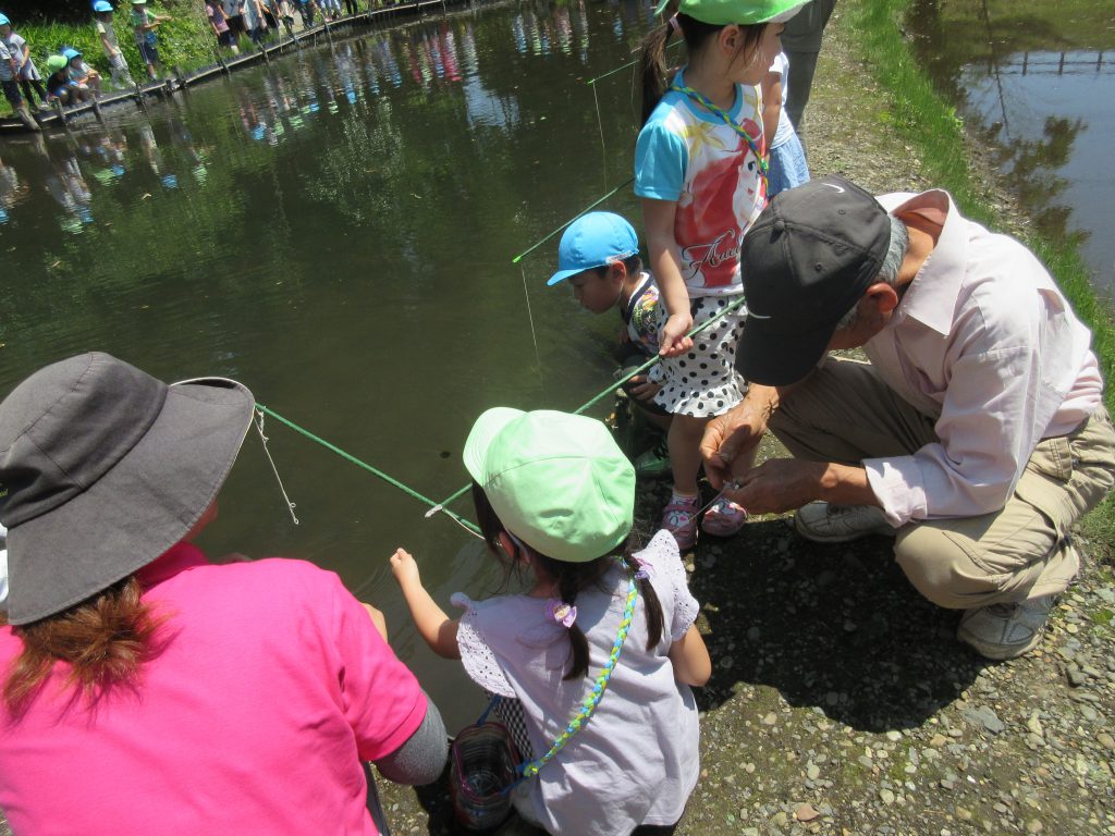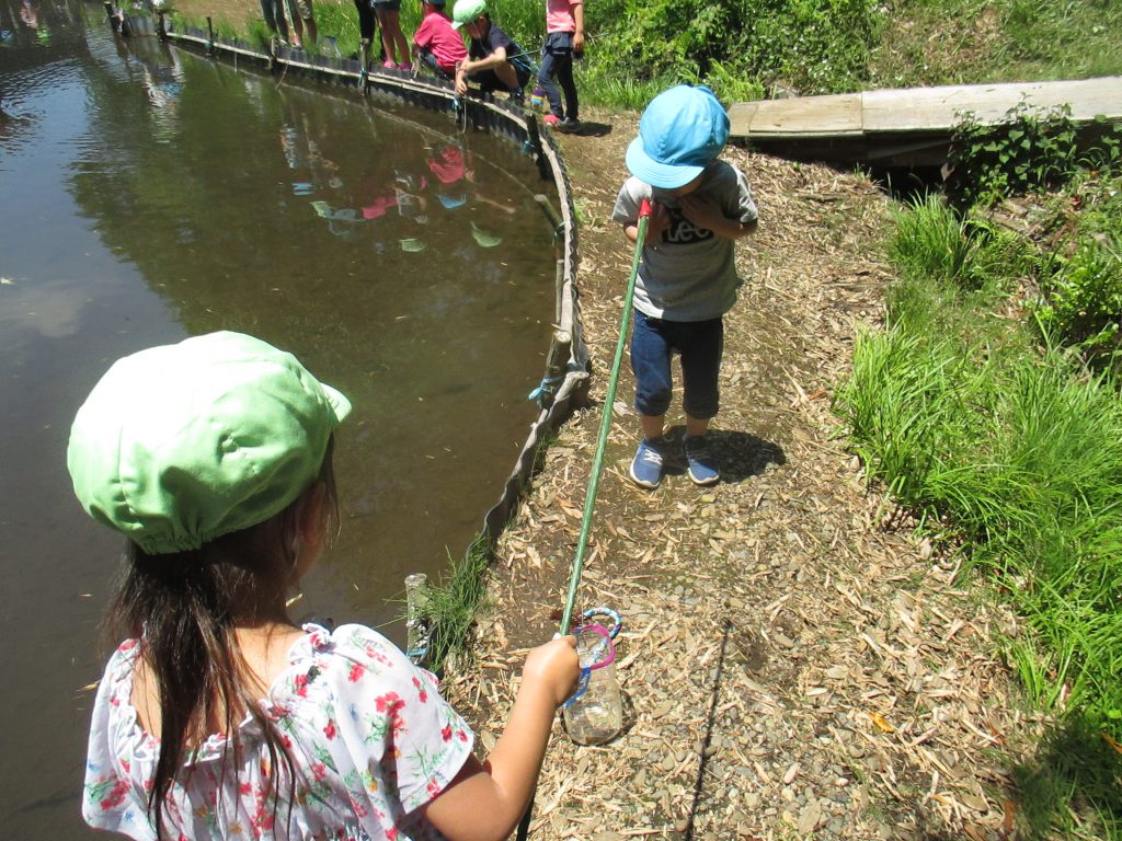 釣竿の使い方も教えてもらいました。年長さんの竿を貸してもらっていっしょにザリガニ釣りをします。