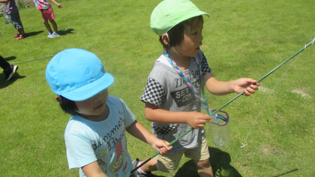 年中さんの持つ竿を,年長さんがそっと持ってあげています。