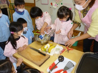 さて、次は腕の見せどころ 粉を混ぜる 焼く 切る 飾る………いただきます。いろいろな作業が入りました。自分たちでおいしいものを料理する楽しさが見えていました。