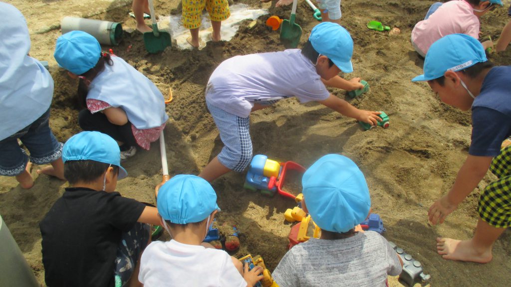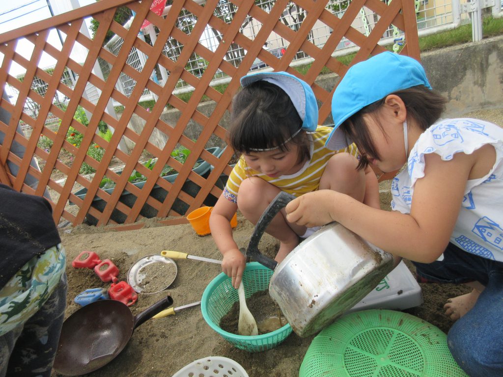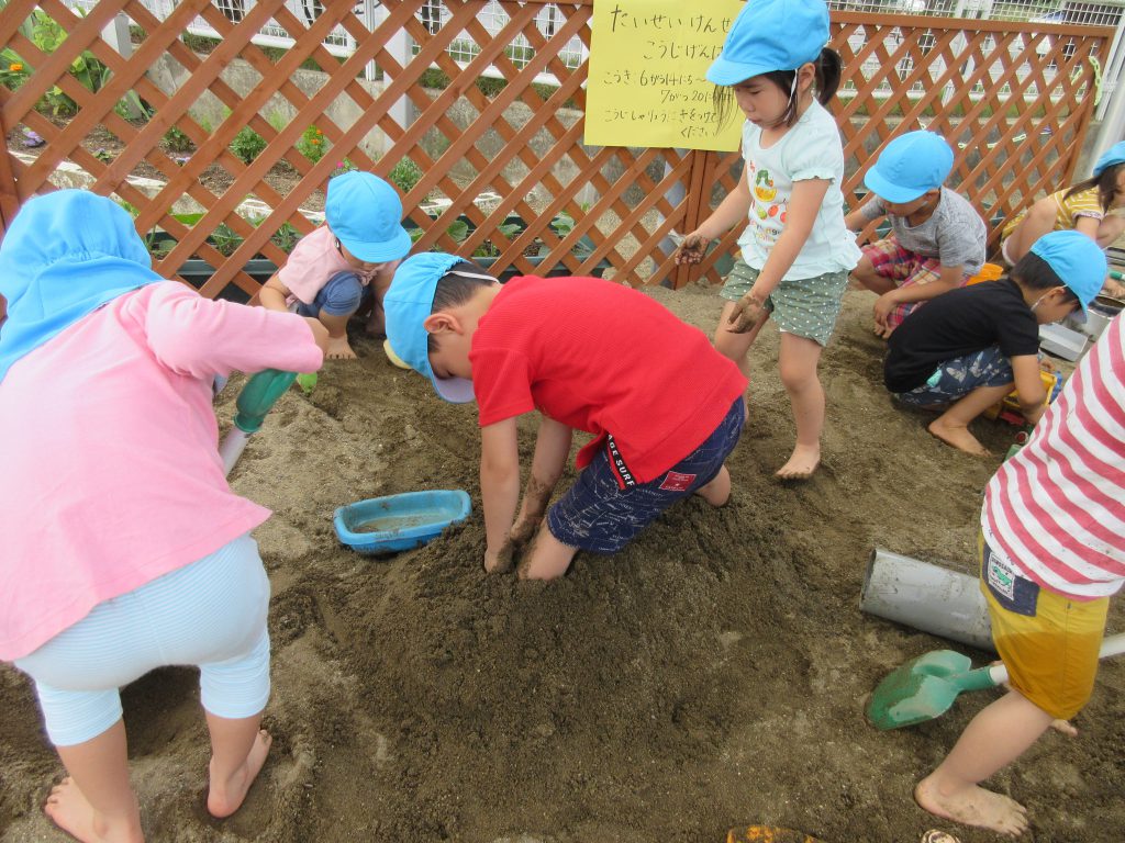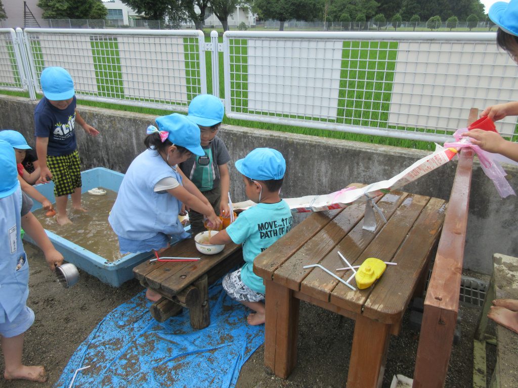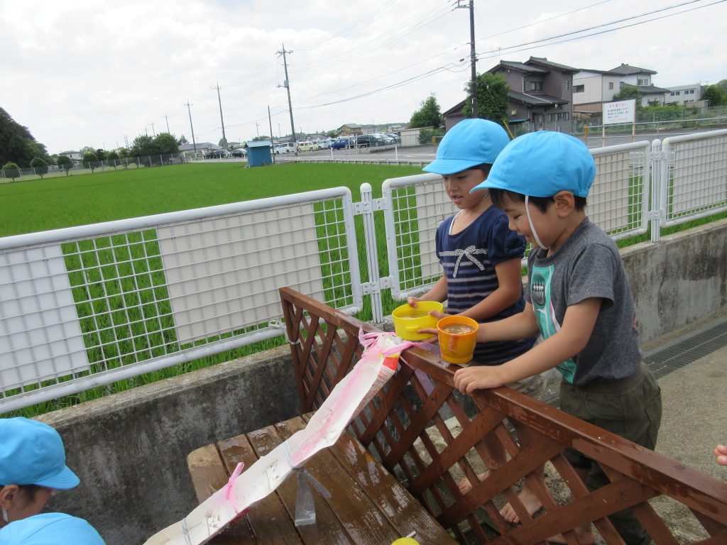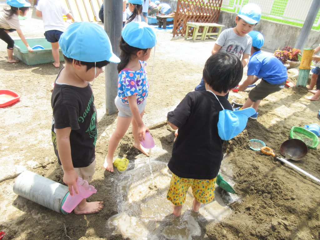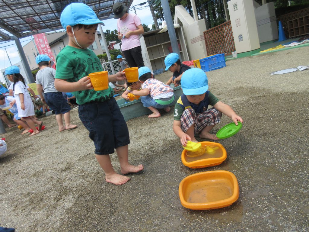 水遊び 2019 6/14 ニュース 今日は砂場で水遊びをしました。 はだしになると「気持ち〜」とうれしそうな表情を見せながら遊んでいました。 水をたくさん入れよう!! 水をそ〜っと運んで・・・・ 流しそうめん!「おいし〜い」 流すよ〜!! 足が砂の中に隠れてしまいました! 道路作り!!工事現場です。 お料理を作ろう!お母さんみたいだね! これから水遊びが楽しい季節になっていきます。この時期ならではの遊びを楽しみたいと思います。 ニュース URLをコピーしました! 今日の給食 6月13日(木) 今日の給食 6月14日(金) コメント コメントする コメントをキャンセルコメント ※ 名前 ※ メール ※ サイト 次回のコメントで使用するためブラウザーに自分の名前、メールアドレス、サイトを保存する。 上に表示された文字を入力してください。 Δ