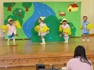 3歳児:劇「とりかえっこ」大好きな絵本を題材に劇を作りました。短い台詞を覚え、「ピヨピヨピヨ」大変可愛らしい姿でした。一年目の担任ですが、子供達と上手に楽しんで演じていました。ーーひまわり組よりーー