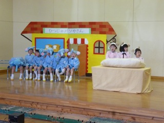 3歳児:劇「ひつじのパンやさん」 昨年4月に泣きながら登園。お母さんを困らせていました。でも、今は。こんなに大きくなりました。ーーたんぽぽ組よりーー
