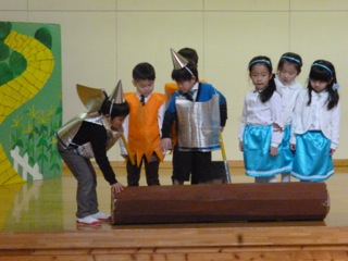 5歳児:劇「オズの魔法使い」どなたもご存知のことでしょう。突然竜巻が起こり、ドロシーの家は、小人の国に飛ばされてしまいました。そこで、いろいろなもの達と出会っていきます。ブリキのきこりとかかし。何やら困った事が………。ーーふじ組よりーー