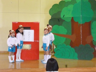 4歳児:劇「ぽんたとたぬ吉のじどうはんばいき」葉っぱを入れてお願いをすると、自動販売機から欲しい物が出てきます。本当にこのような自動販売機があったらいいですね。とても楽しく演じていました。 ーーうめ組よりーー