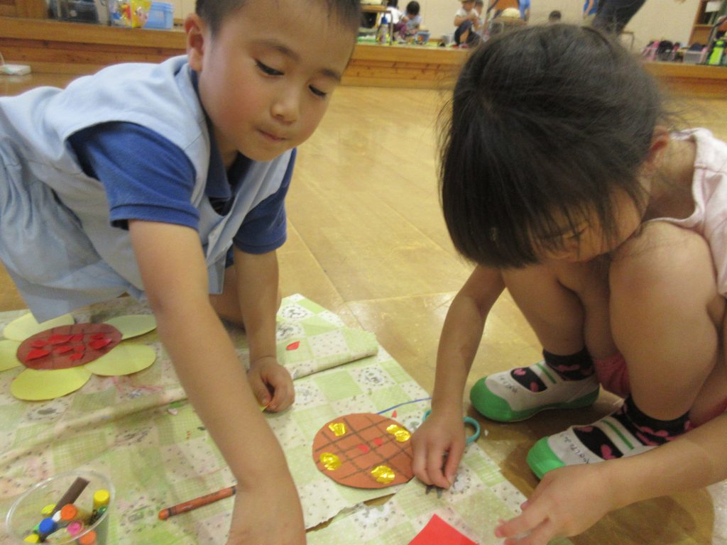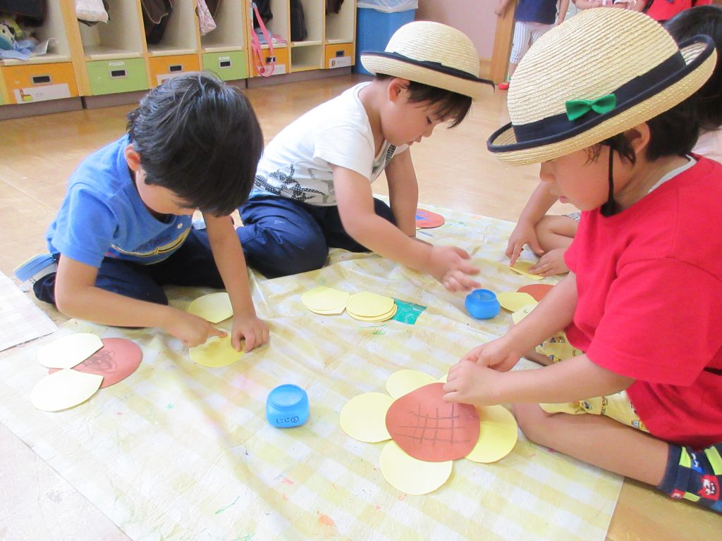 「家にもひまわりの種をまいたよ!」「ひまわりって大きいよね!」と話をしながら,楽しく製作をしていました。