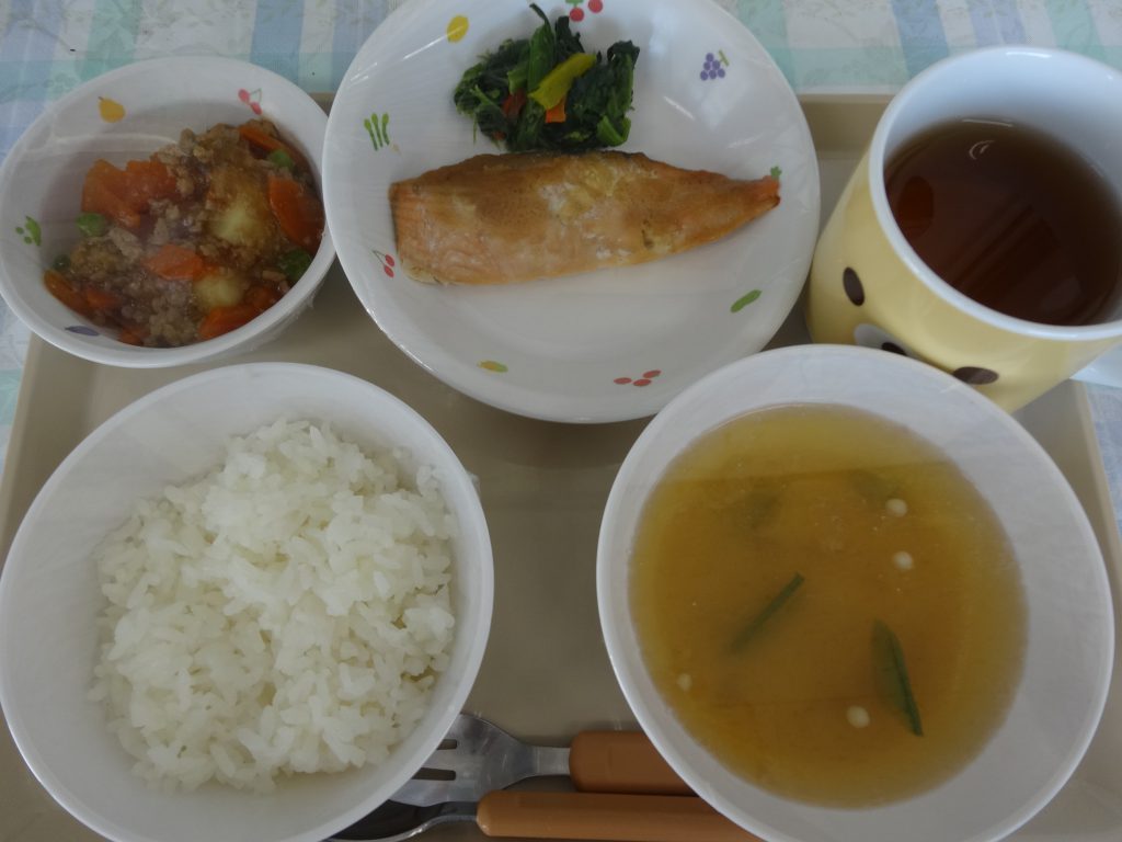 ごはん・鮭の味噌バター焼き・ほうれん草とパプリカのソテー・じゃがいものそぼろ煮・みそ汁(絹さや・えのき・玉ねぎ)