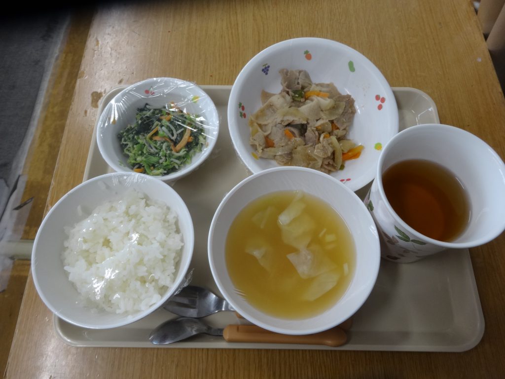ごはん・豚肉の焼き肉風炒め・ほうれん草としらすのごま和え・みそ汁(キャベツ・生揚・長ねぎ)