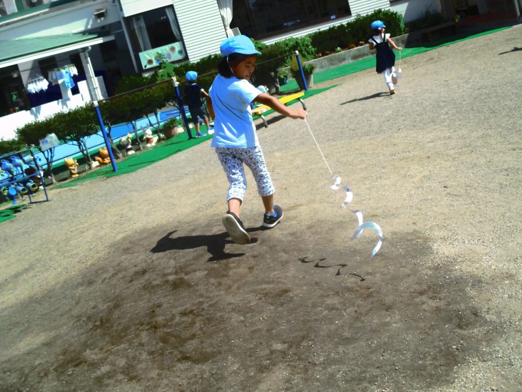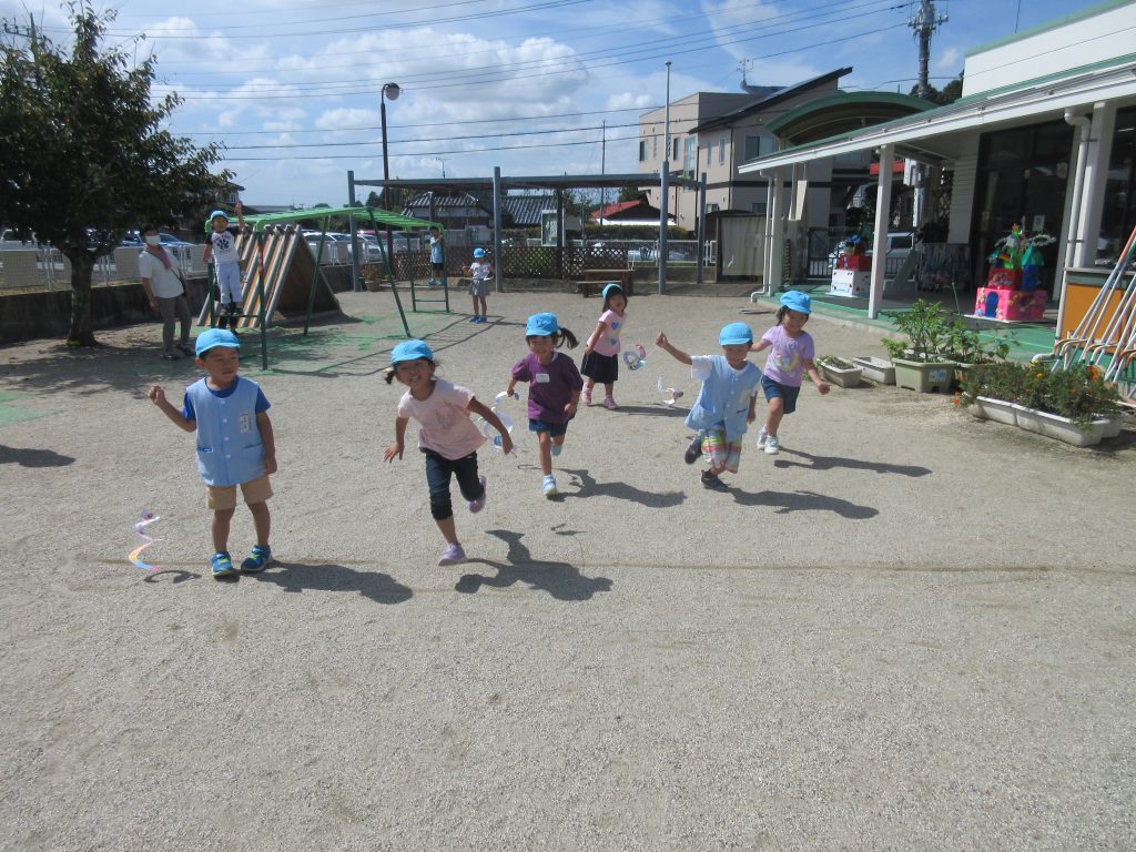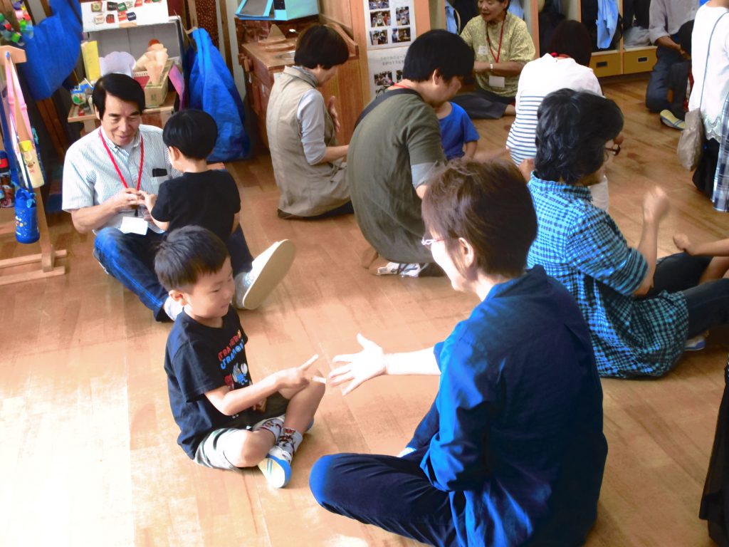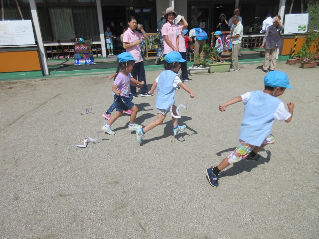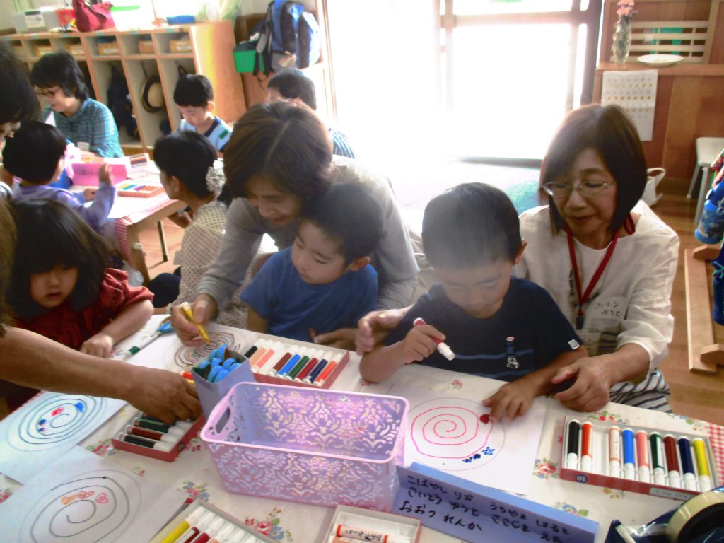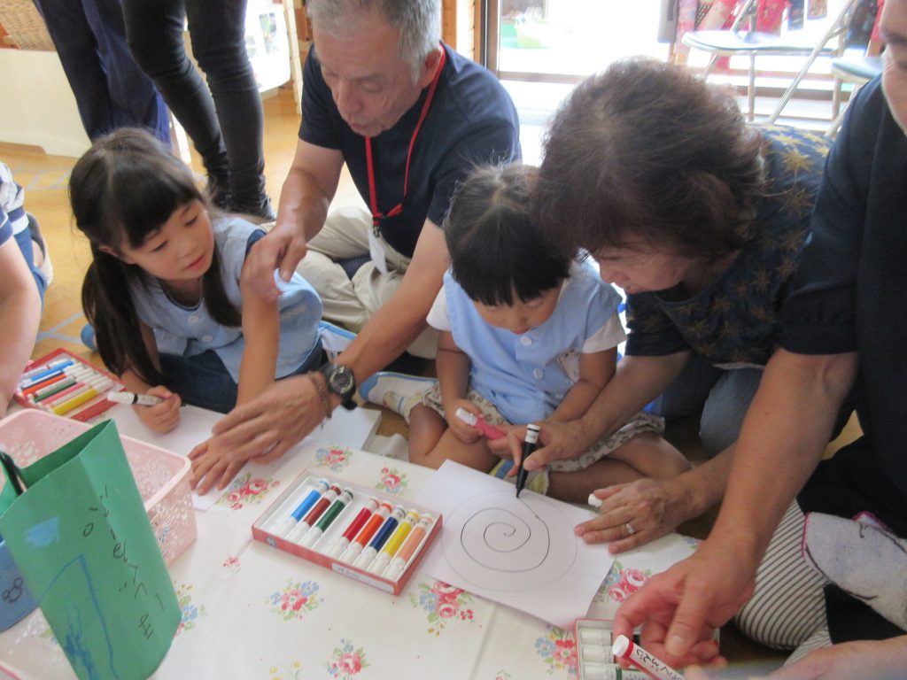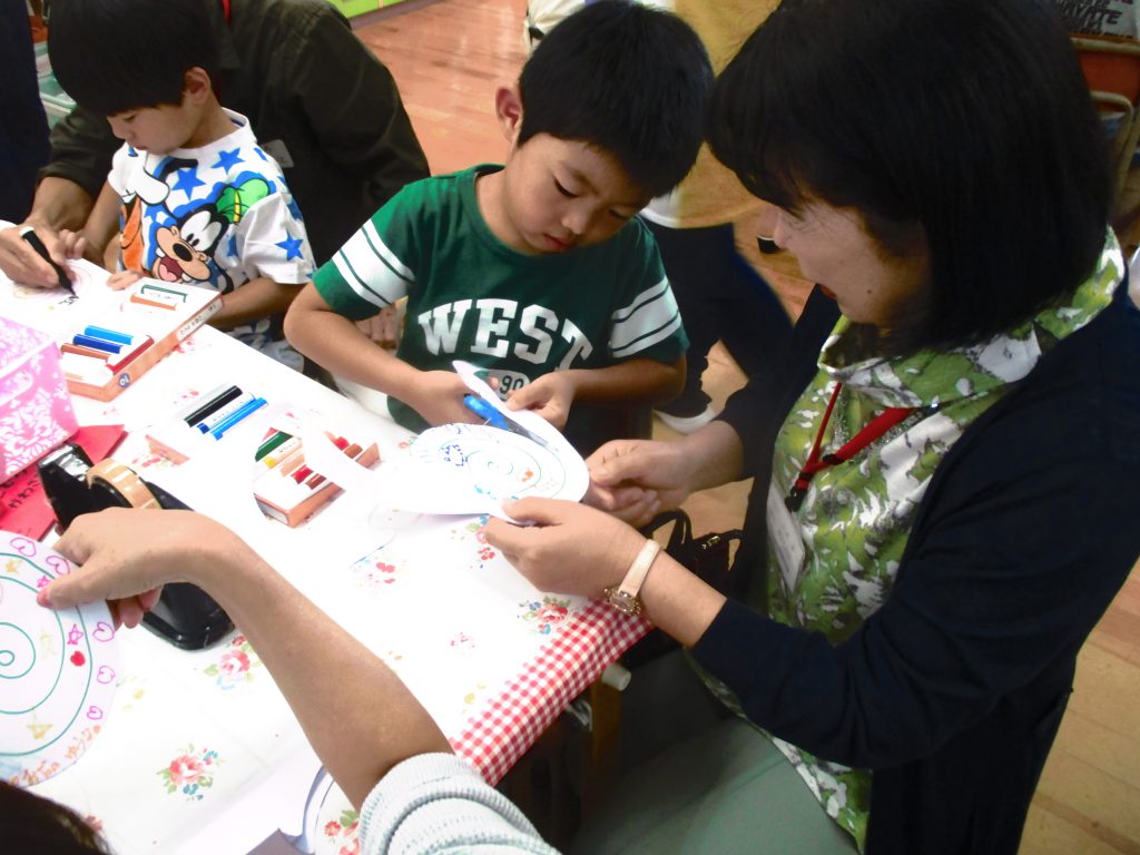 祖父母の方々と一緒に触れ合い遊びやくるくる凧作りをする子どもたちは,とても嬉しそうな表情を見せていました。