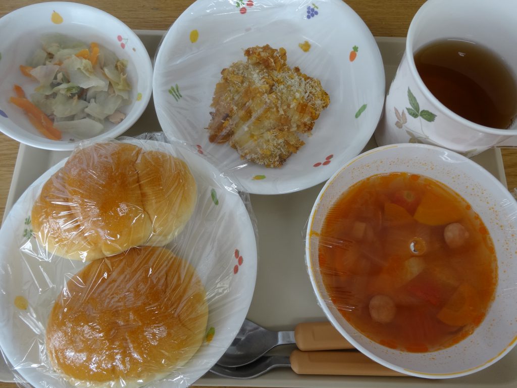 バターロール・サクサクチキン・ツナと野菜の炒め物・ミネストローネ(ウィンナー・玉ねぎ・人参・セロリ・マカロニ)