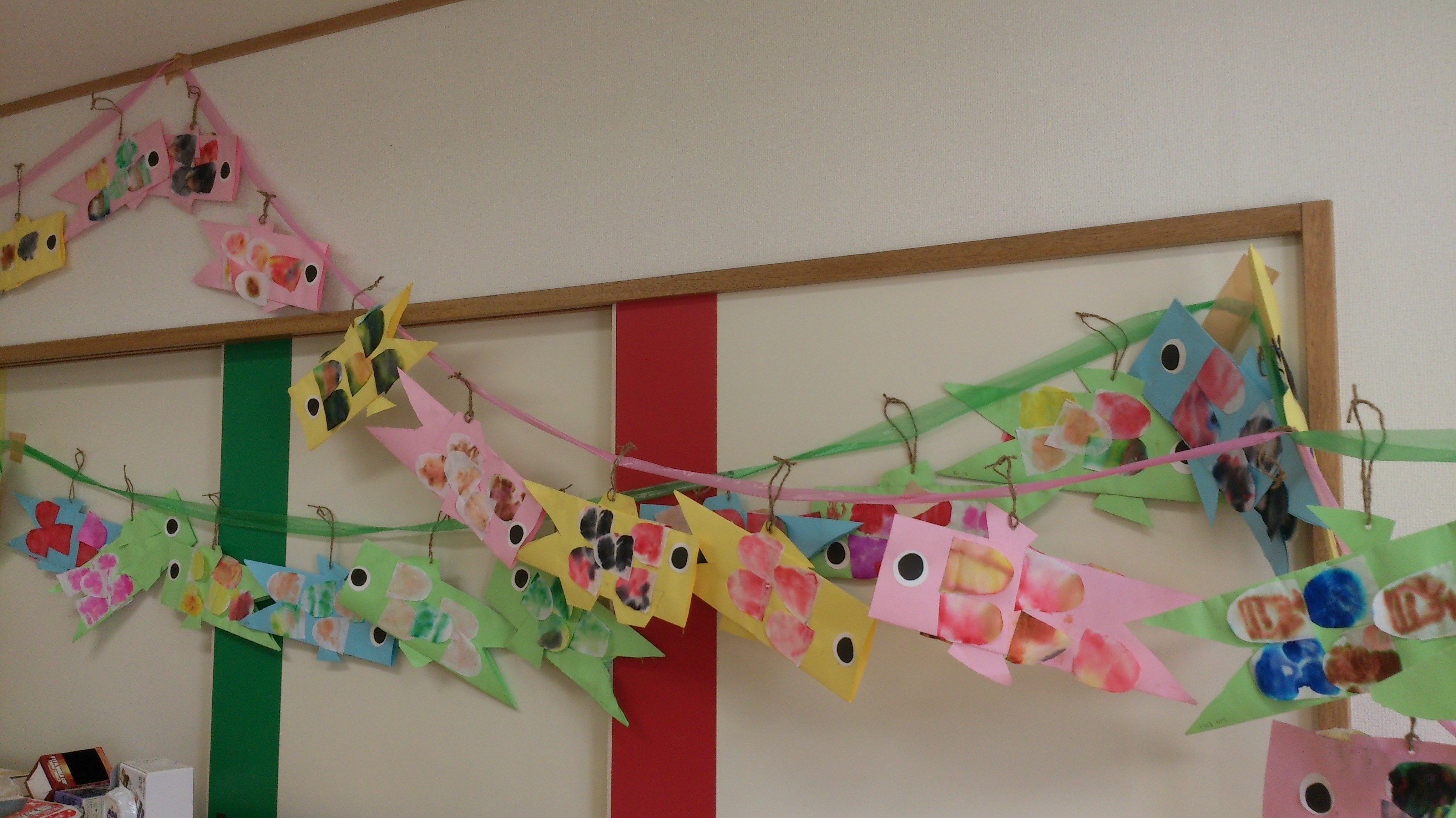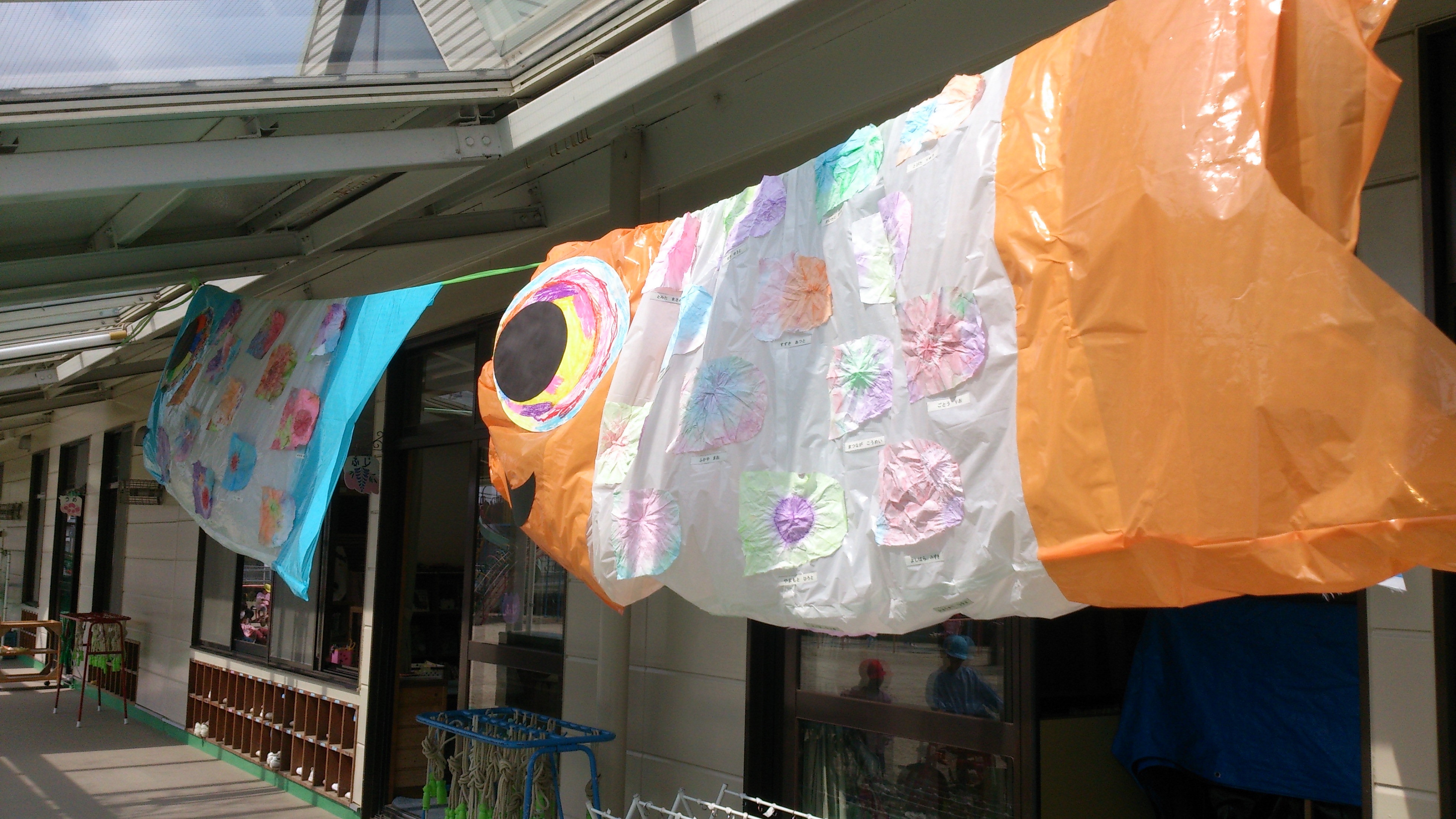 一人一人が色染めしたうろこを、大きなこいのぼりに貼りました。