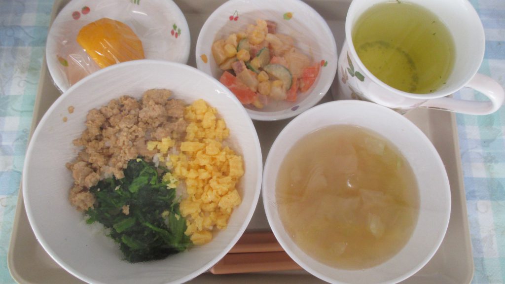 三色そぼろ丼・マセドアンサラダ・かき・みそ汁(キャベツ・人参・玉ねぎ)