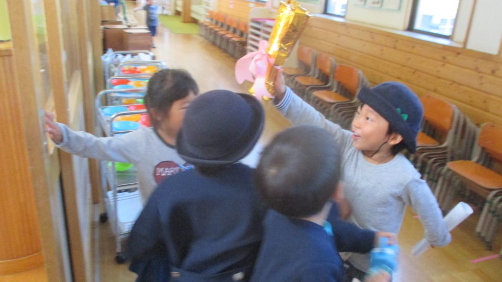 ご褒美のトロフィーを受け取り,大喜びでした。「やっぱり見てたんだ」「どこにいたのかな?」怪盗K・Kへの想像がますます膨らむ子どもたちでした。