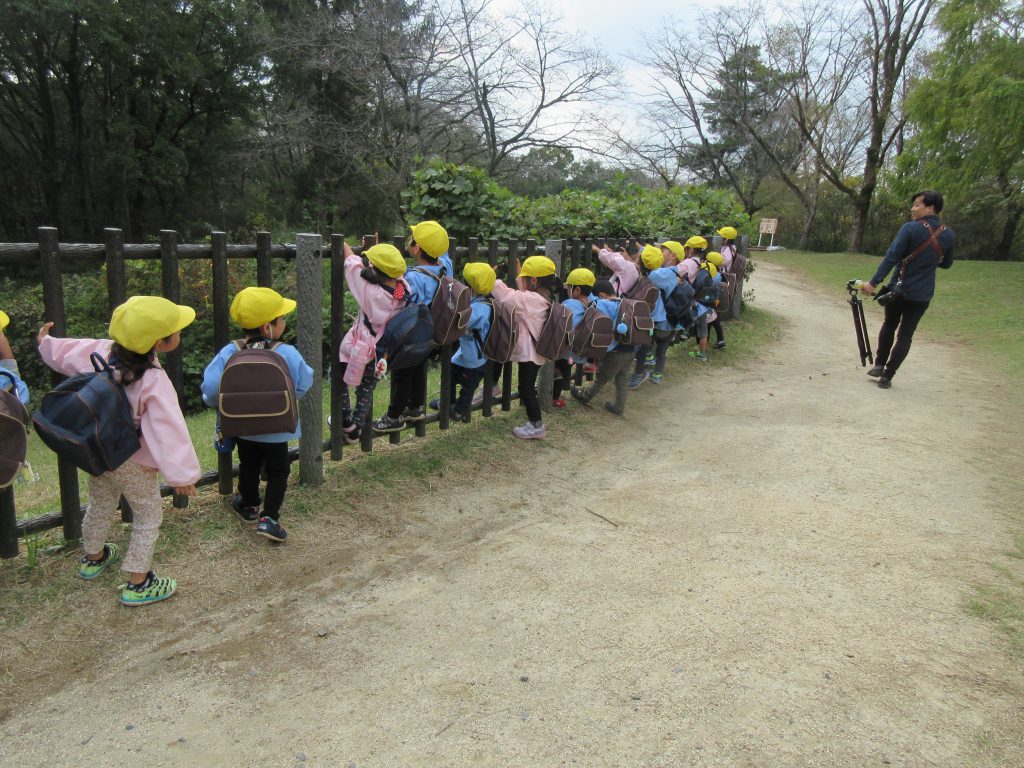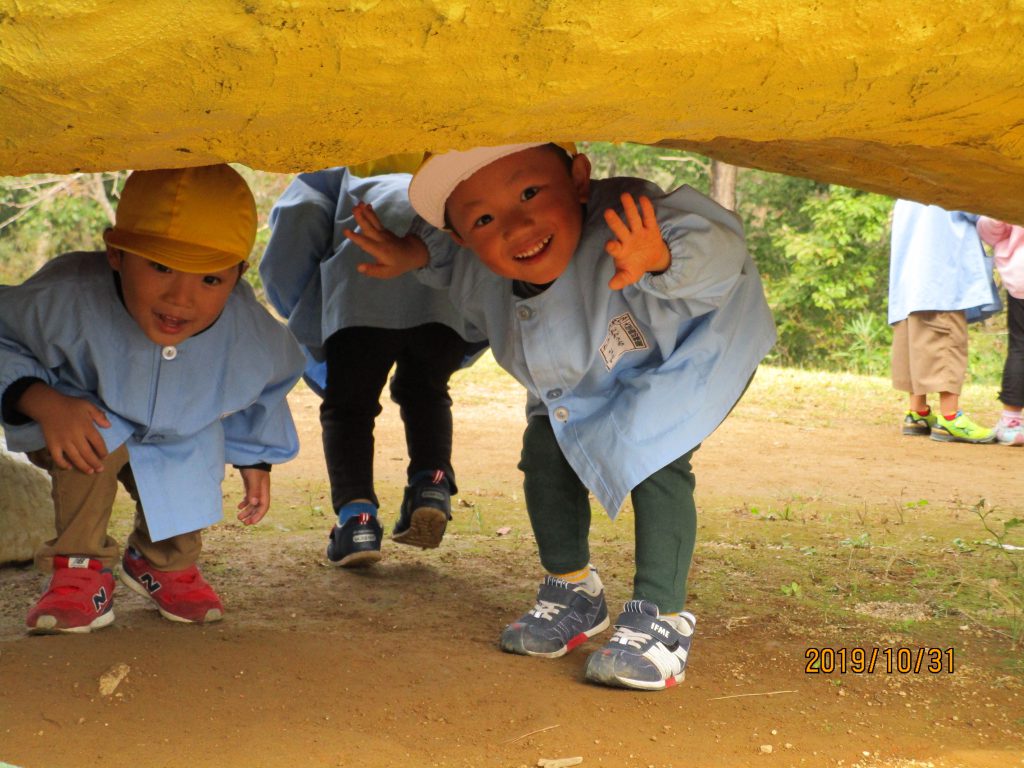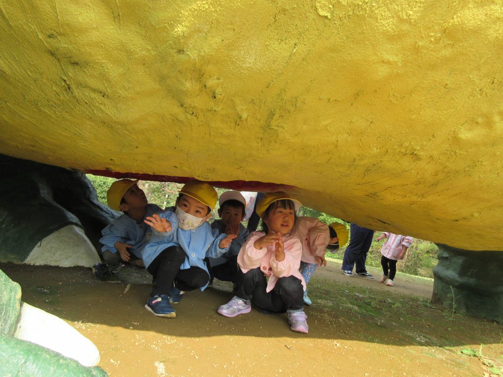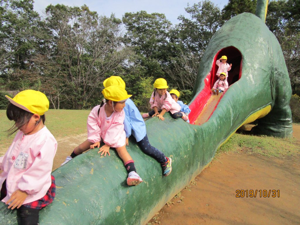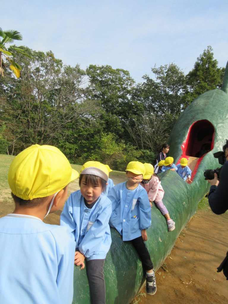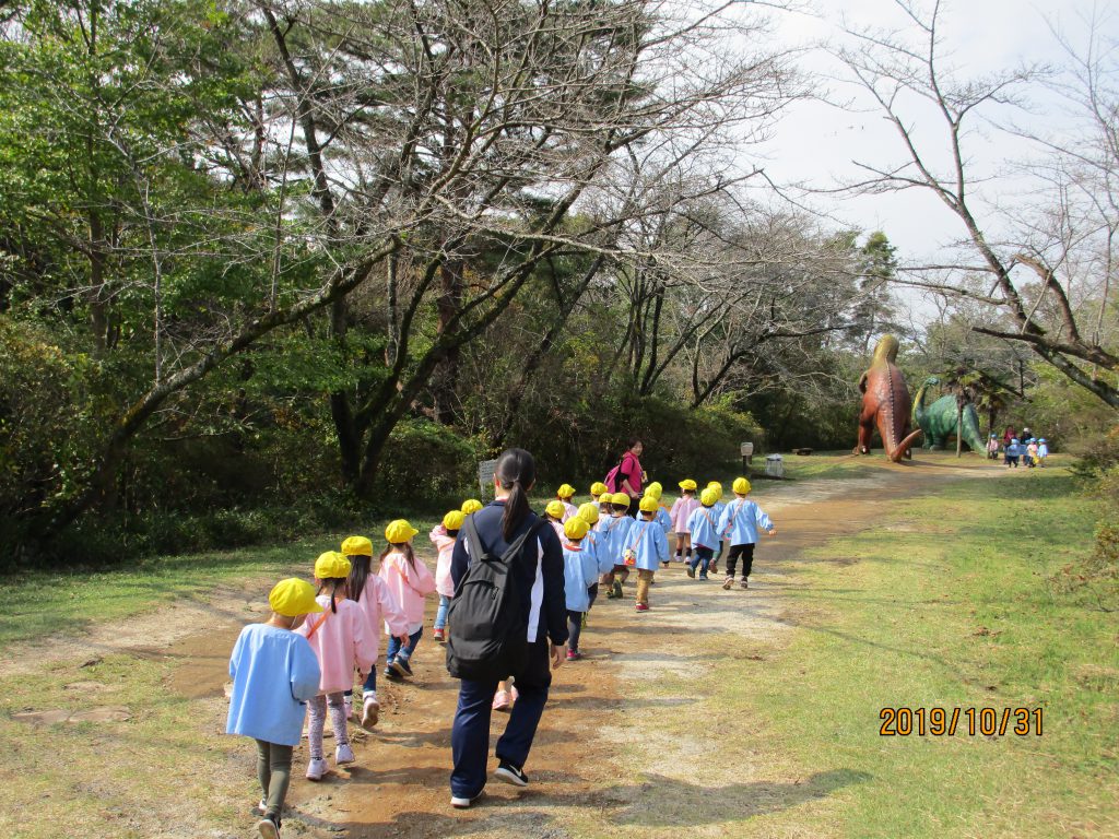 「何か音がするね」「恐竜はまだいないのかな?」と会話を楽しみながら,友達と手をつないで歩いていました。