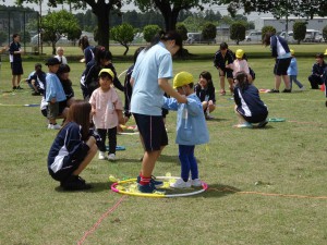 タンポポ島(フラフープ)や池(ミニフープ)、川(ロープ)を探検したり、一緒にゲームをしたり「タオルたいそう」をしたりと、楽しいひとときを過ごしました。