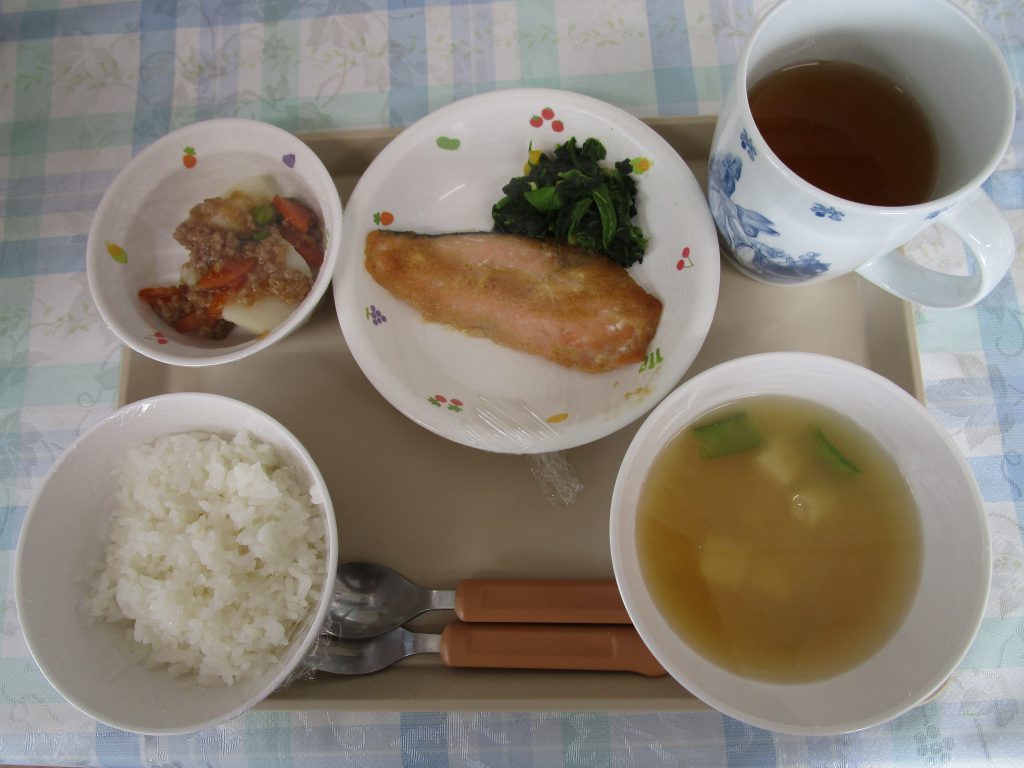 ごはん・さけのみそバター焼き・ほうれん草とコーンのソテー・ジャガイモのそぼろ煮・みそ汁(絹さや・豆腐・玉ねぎ)