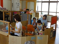 バスごっこや水族館ごっこ・色水遊びなど、楽しそうに遊ぶ子どもたちにつられて、学生も笑顔いっぱいでした。