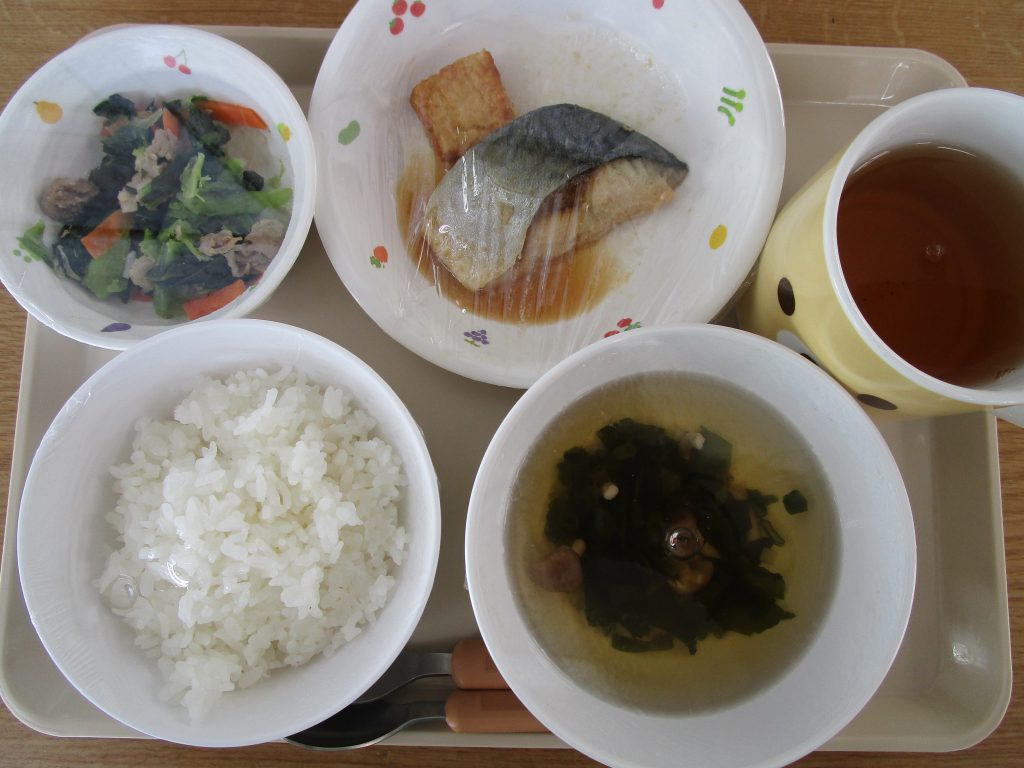 ごはん・サバの味噌煮・小松菜と豚肉の炒め物・すまし汁(わかめ・しめじ・小ねぎ)