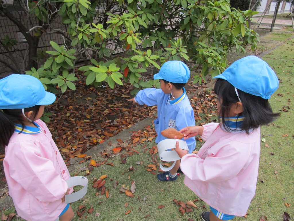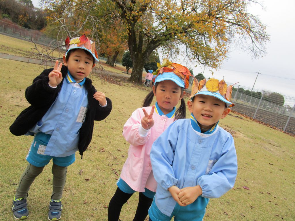 短大の芝生へ散歩に出かけると,赤や黄色に色づいた葉がたくさん落ちていました。今日はみんなで落ち葉の冠作りを楽しみました。