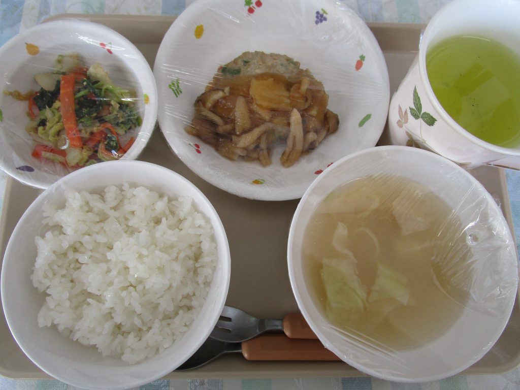 ごはん,豆腐ハンバーグ,和風きのこソース,白菜と小松菜のごま和え,みそ汁(キャベツ・生揚・長ねぎ)