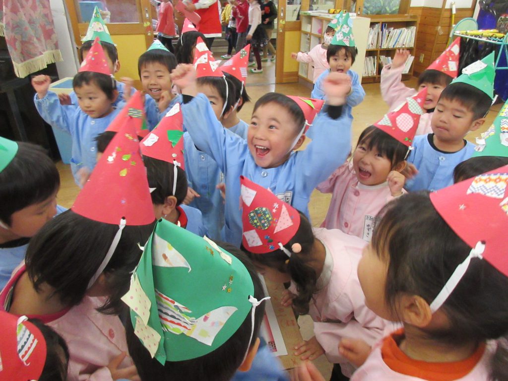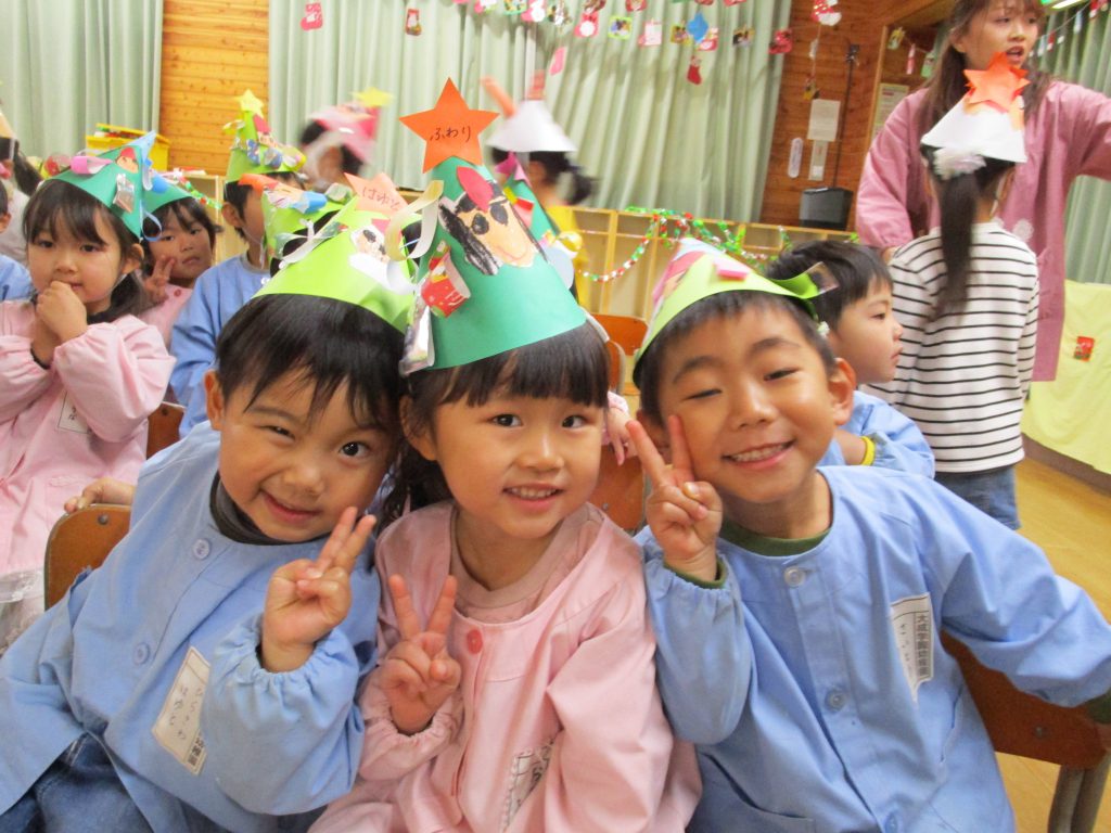 うめ組・もも組はクリスマスツリーの帽子です。サンタさんもいます❤️