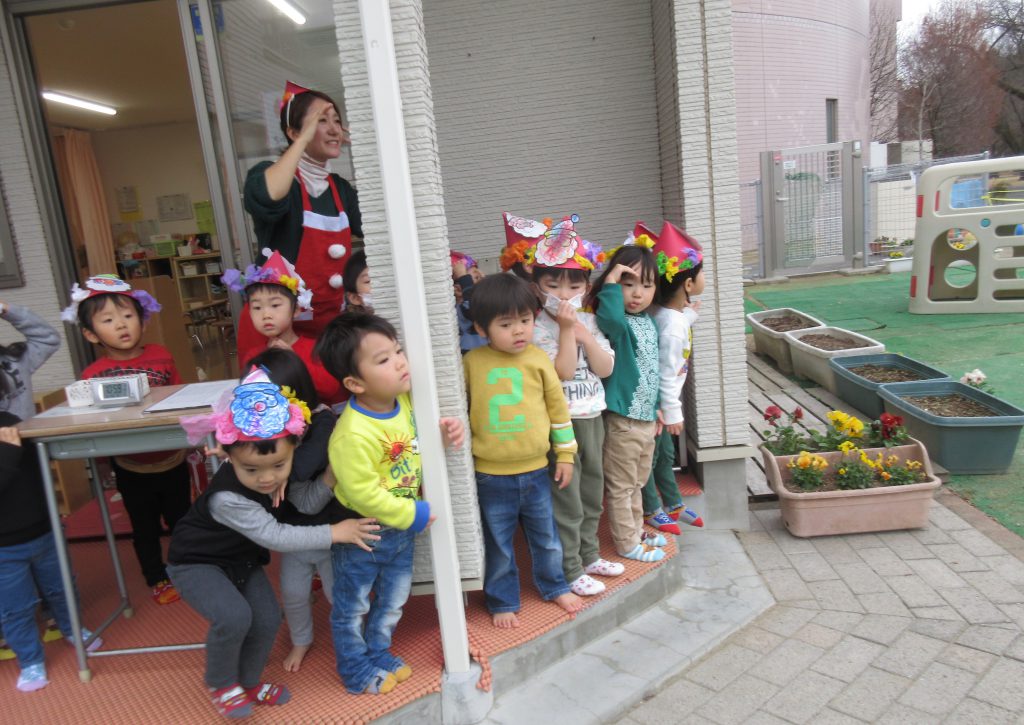 ひまわり組・たんぽぽ組は,クリスマスカラーの帽子です。
