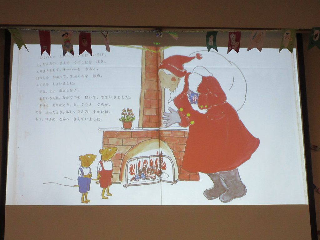 『クリスマスのおきゃくさま』の絵本を読み聞かせです。大きい画面で,映画館のような雰囲気ですね。とても集中して絵本の世界を味わっていました。