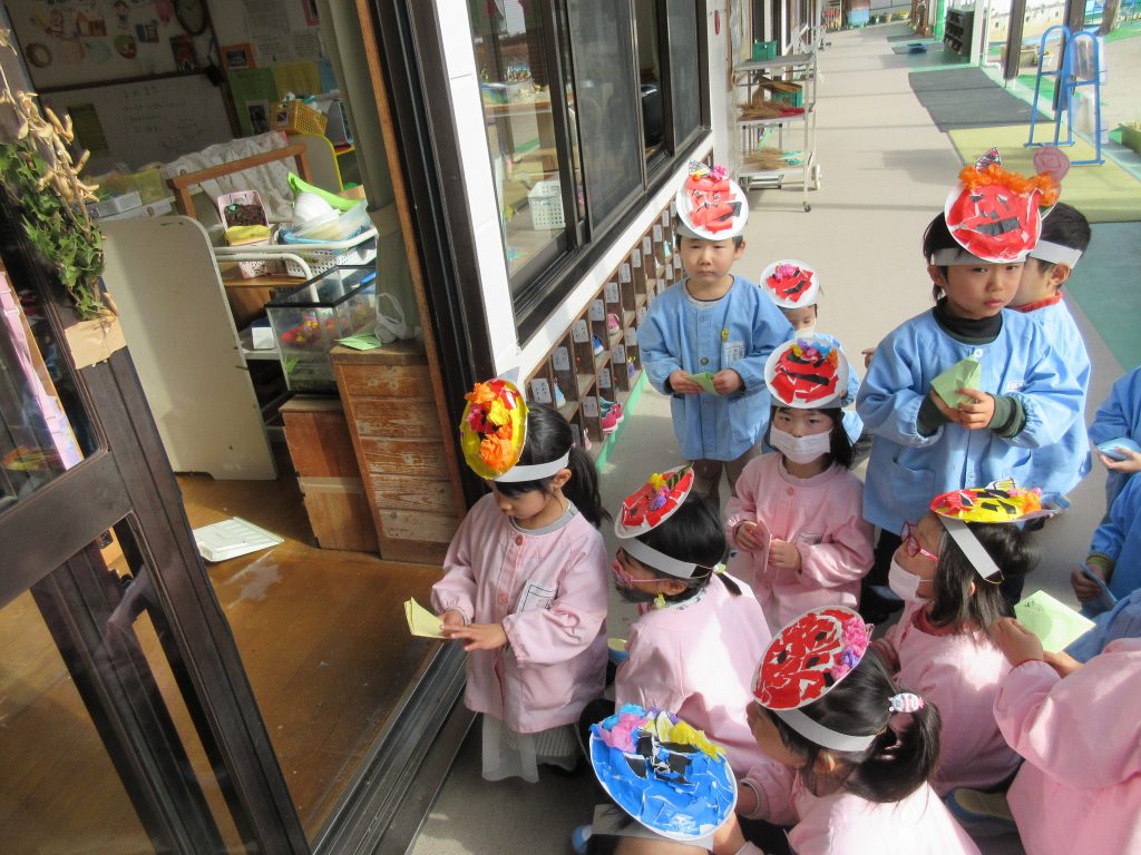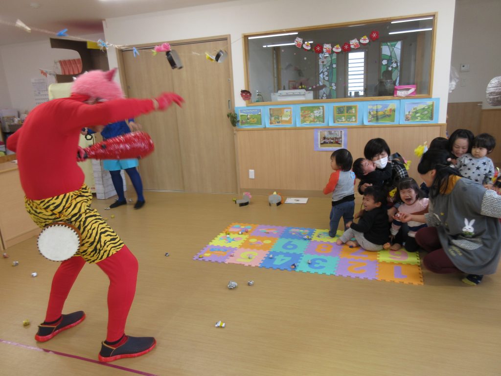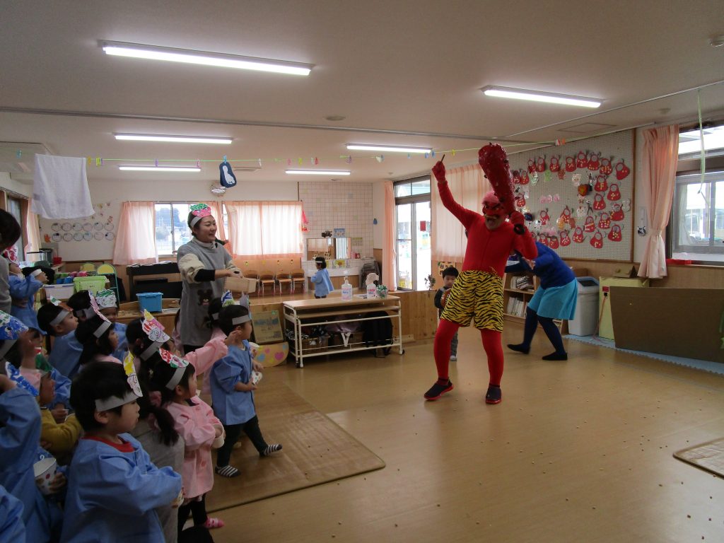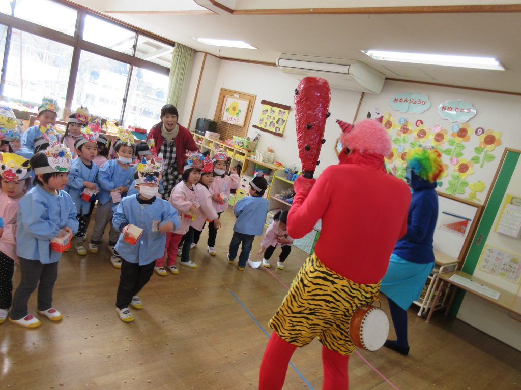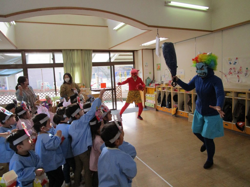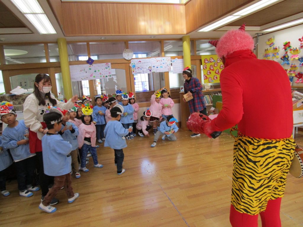 大きな声で「鬼は〜外!」「福は〜内!」と鬼に向かって豆を投げた子ども達。