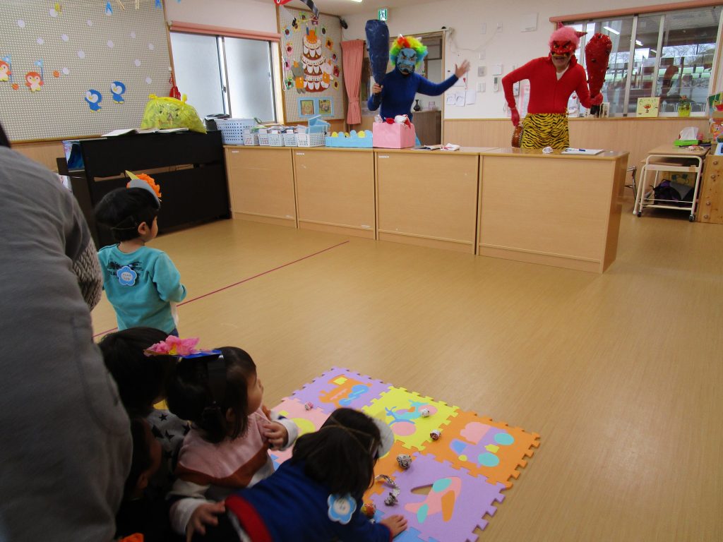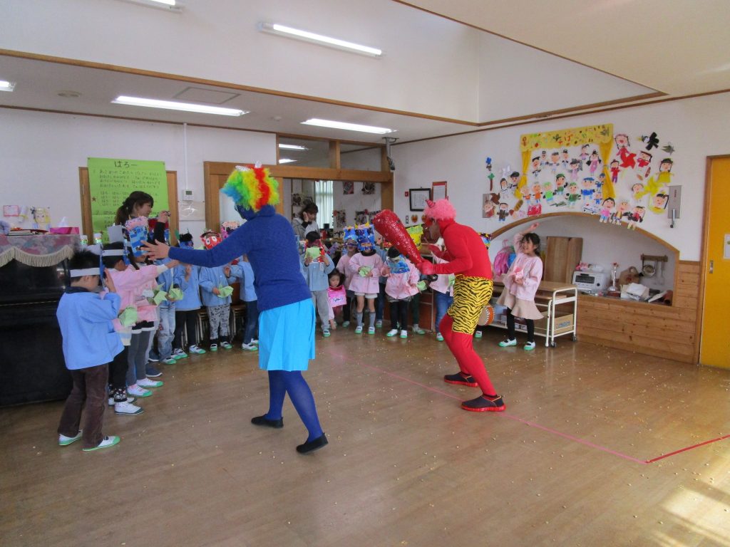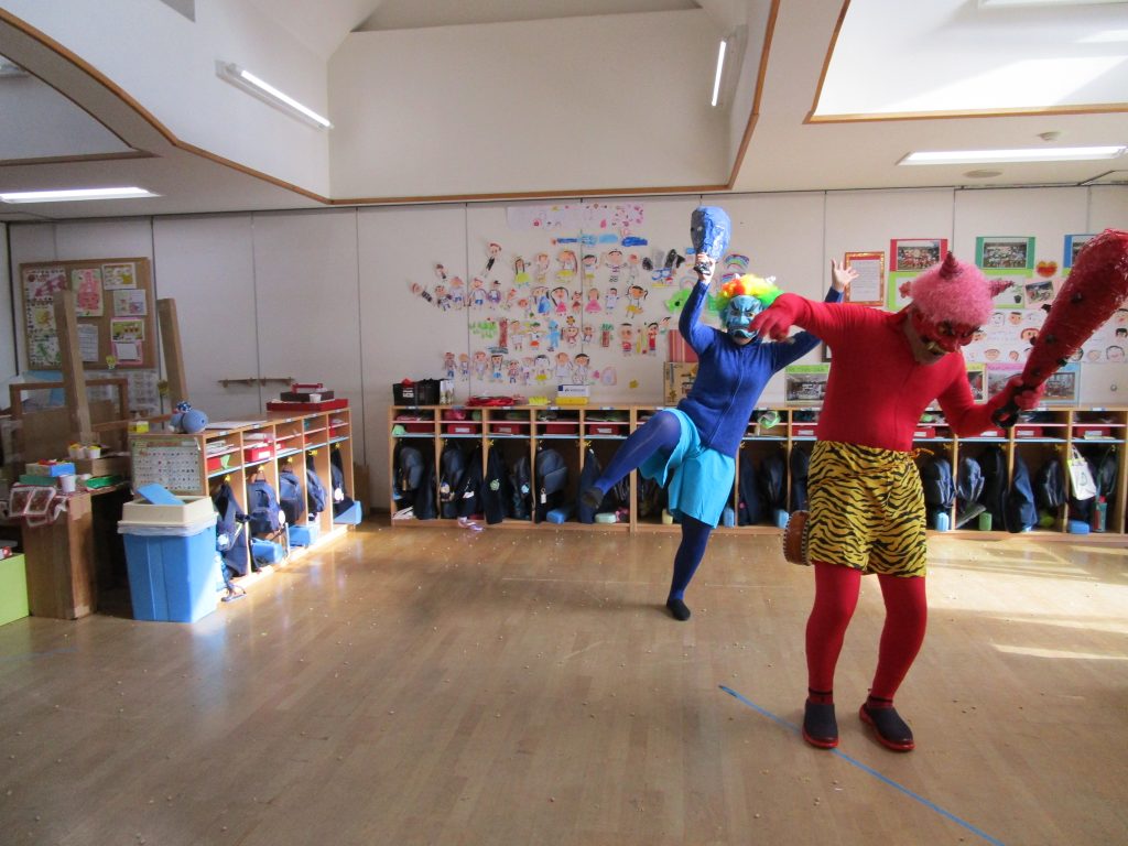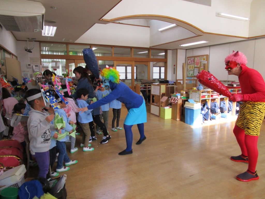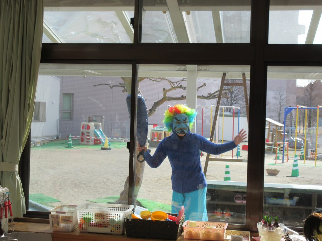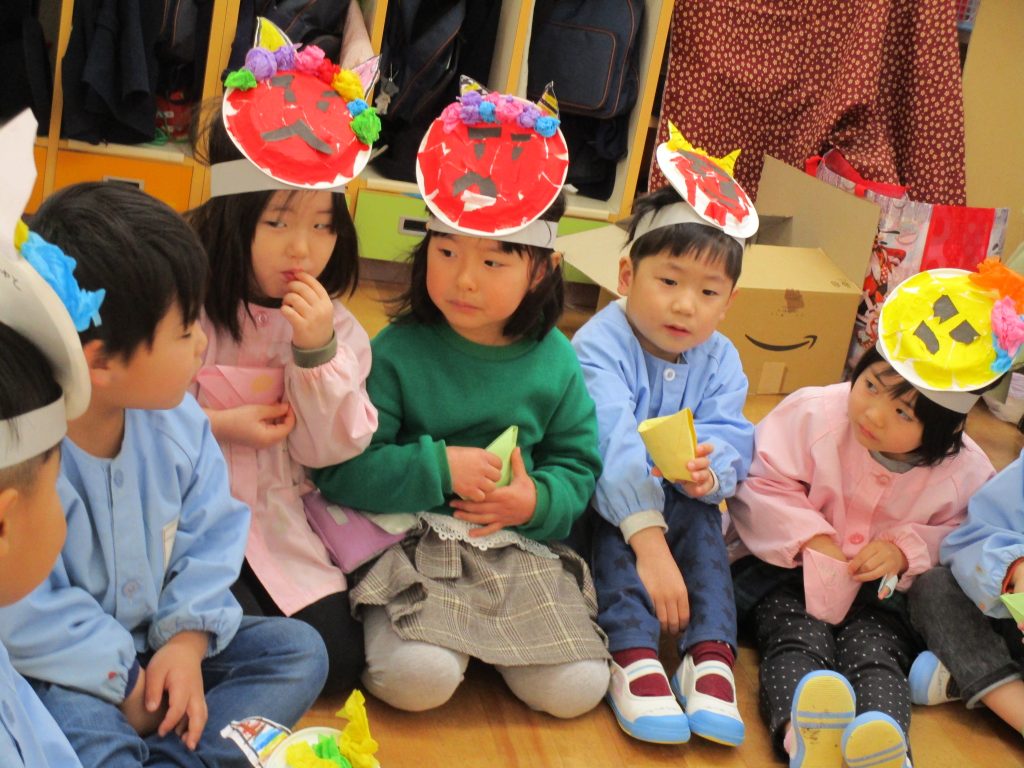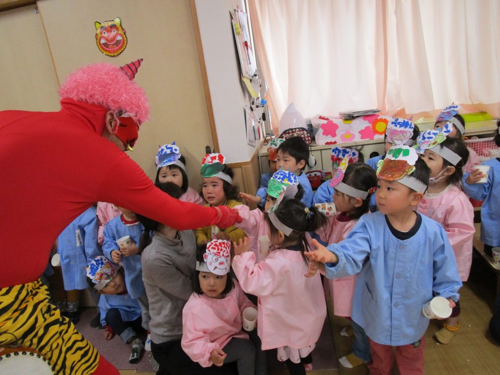 大きな声で「鬼は〜外!」「福は〜内!」と鬼に向かって豆を投げた子ども達。
