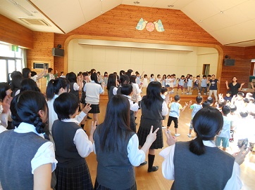 『にじ』の歌を披露した後、『エビカニクス』を高校生と一緒に踊り、握手をして「またきてね」とさようならをしました。