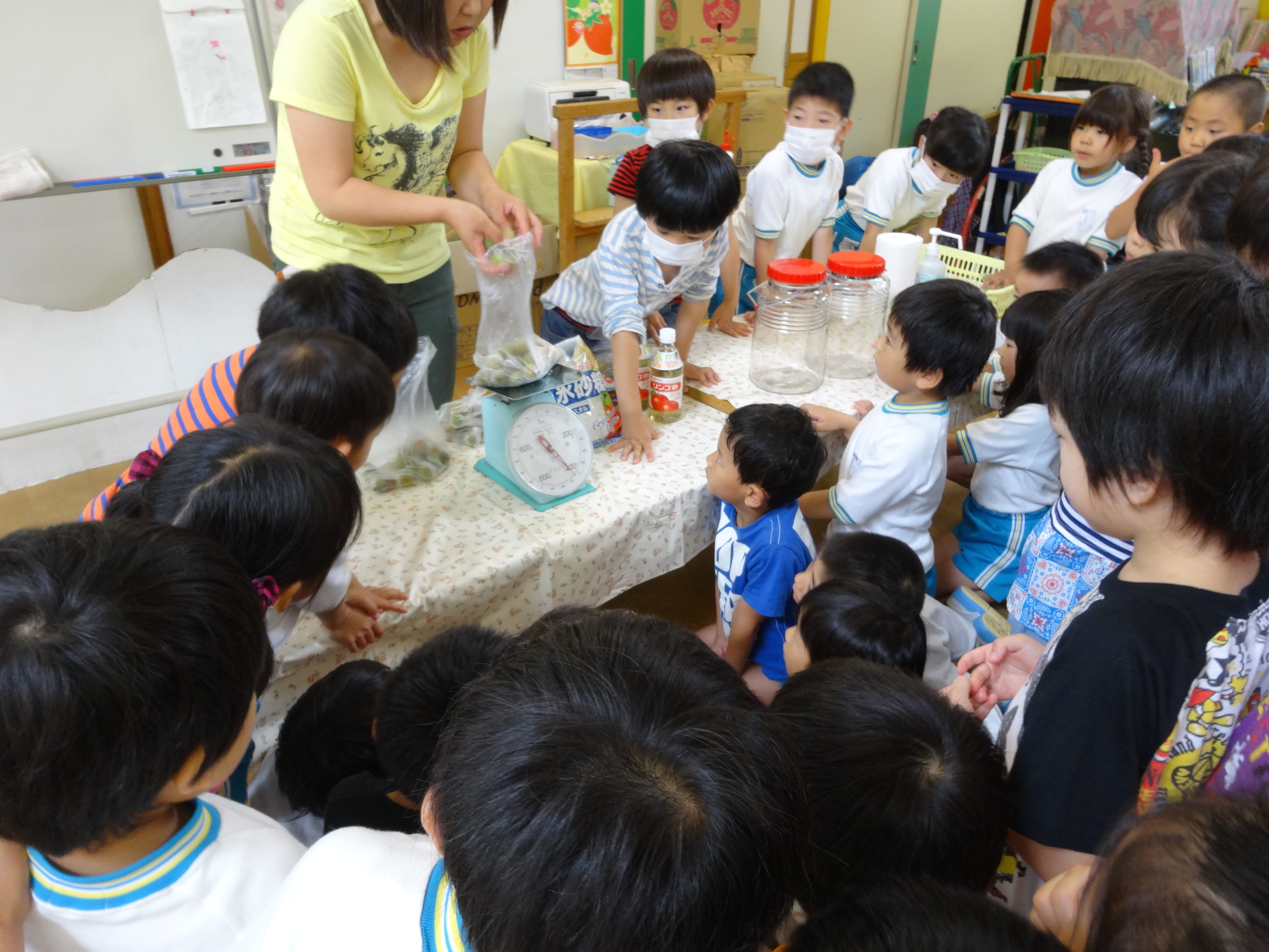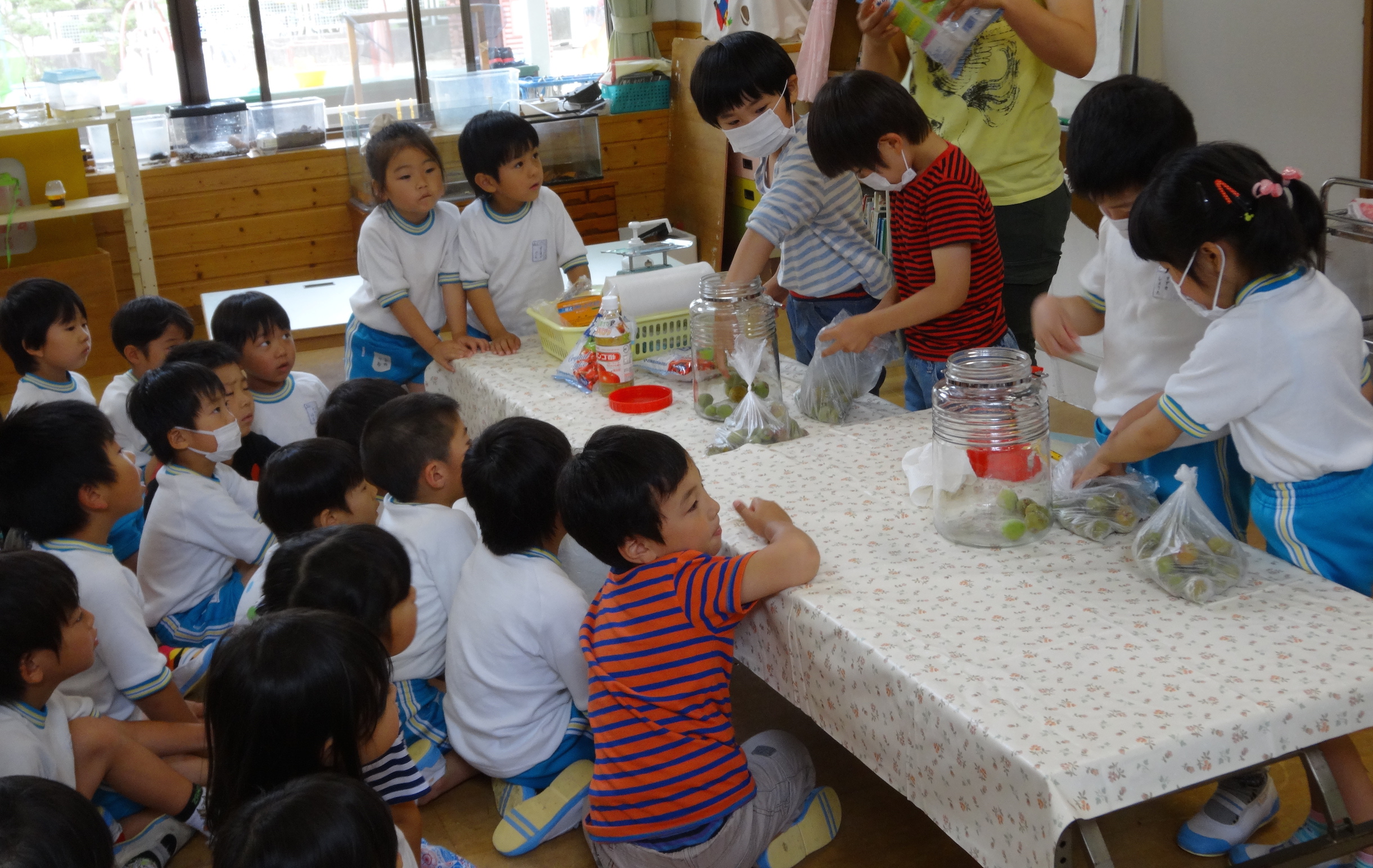 いよいよ瓶に入れます。「ウメ・氷砂糖・ウメ・氷砂糖の順番でいれるんだよね」子ども達はよく話を覚えていました。