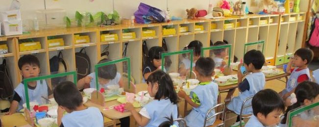 コロナウイルス感染症予防のため,お友達との間にはラミネートで手作りした飛散防止シートを立てていただきます。