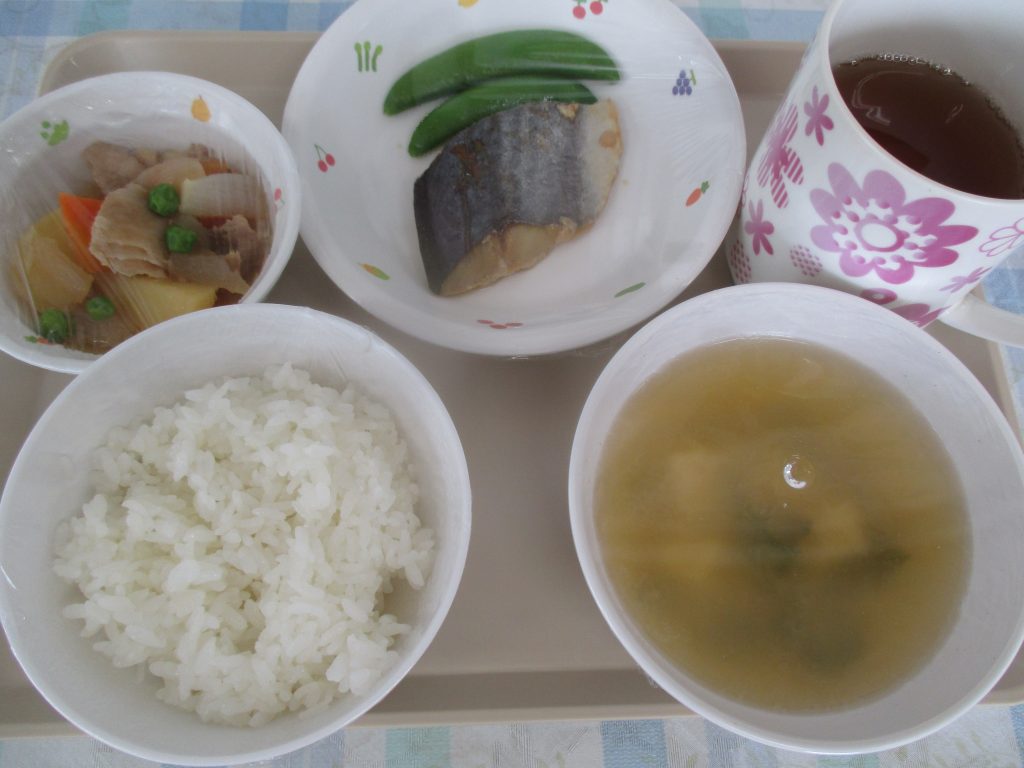 ごはん,さわらの柚庵焼き,スナップえんどう,肉じゃが,みそ汁(わかめ・とうふ・長ねぎ)