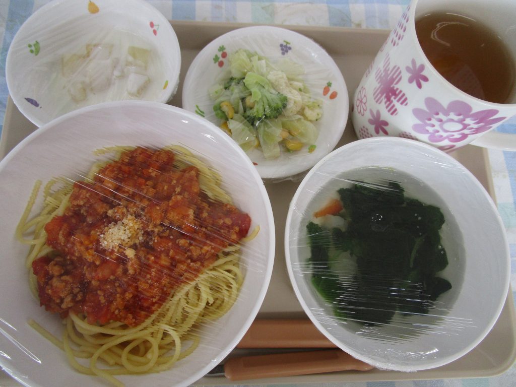 スパゲッティミートソース・花野菜サラダ・ももヨーグルト・コンソメスープ(ほうれんそう・玉ねぎ・パプリカ)