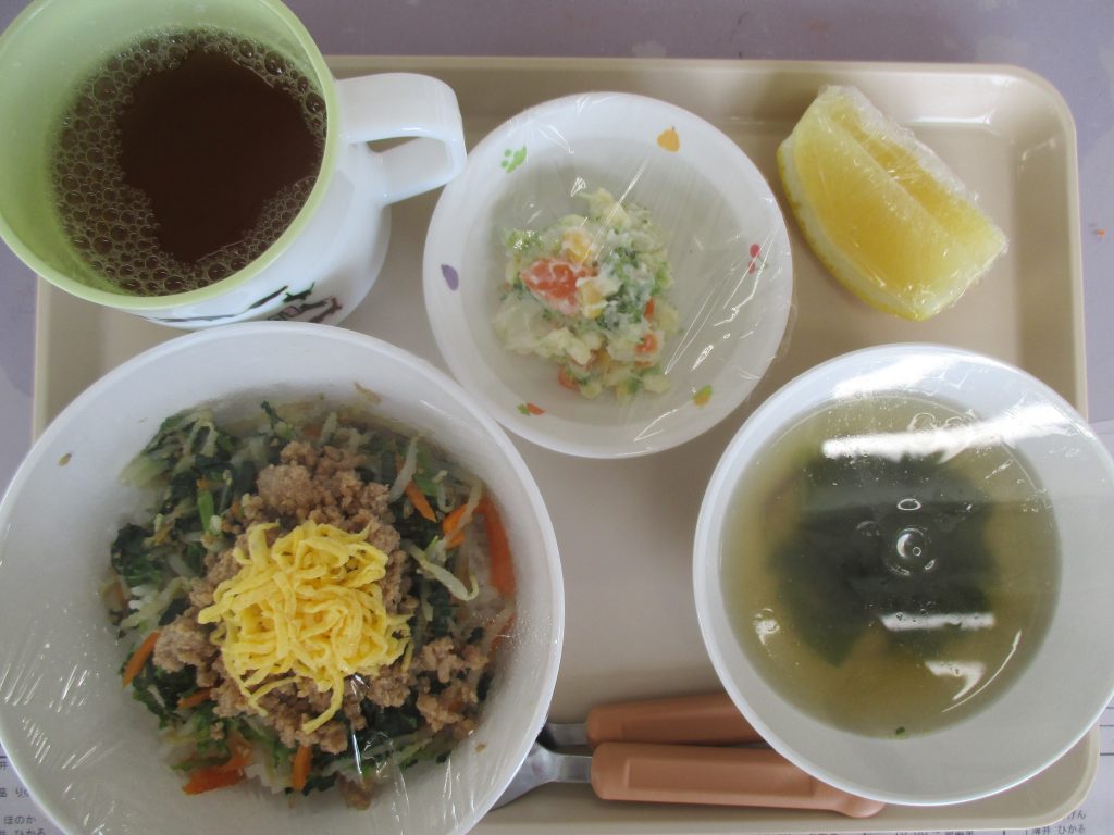ビビンバ丼,チーズポテトサラダ,グレープフルーツ,わかめスープ(わかめ・しいたけ・小ねぎ)