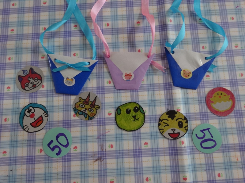 お財布からお金を取り出して、あおむしが大好きなお菓子や食べ物のお面を買いました。