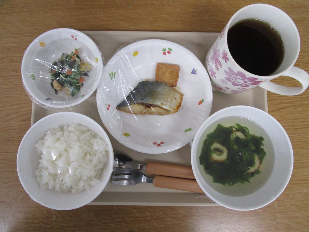 ごはん・サバの味噌煮・厚揚煮・豆とほうれんそうのごまサラダ・すまし汁(わかめ・ちくわ・小ねぎ)