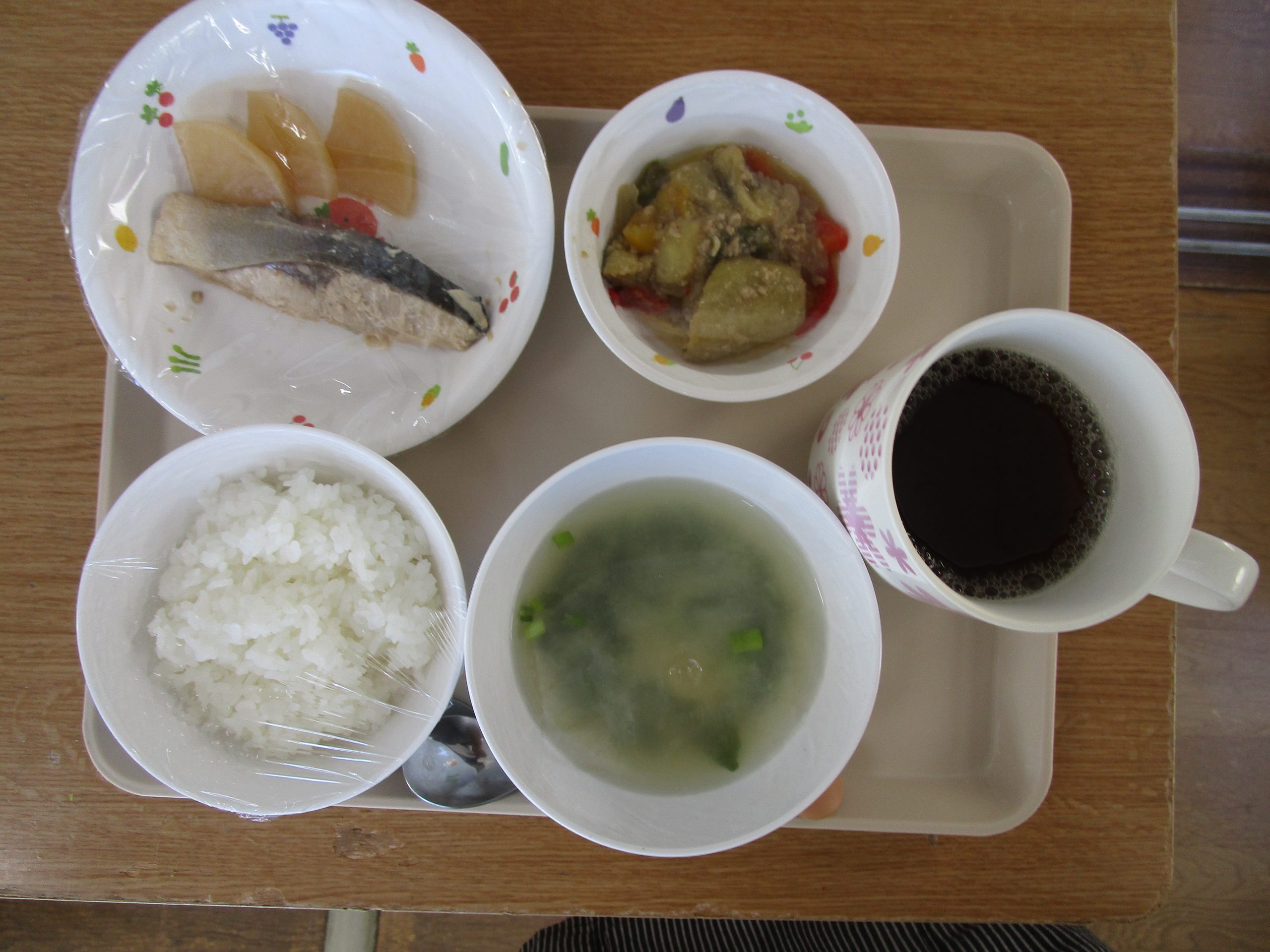ごはん・ぶり大根・なすとピーマンの味噌炒め・みそ汁(わかめ・小ねぎ・じゃがいも)