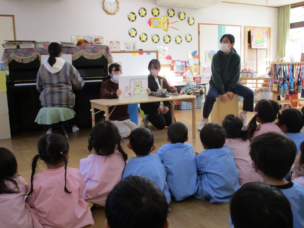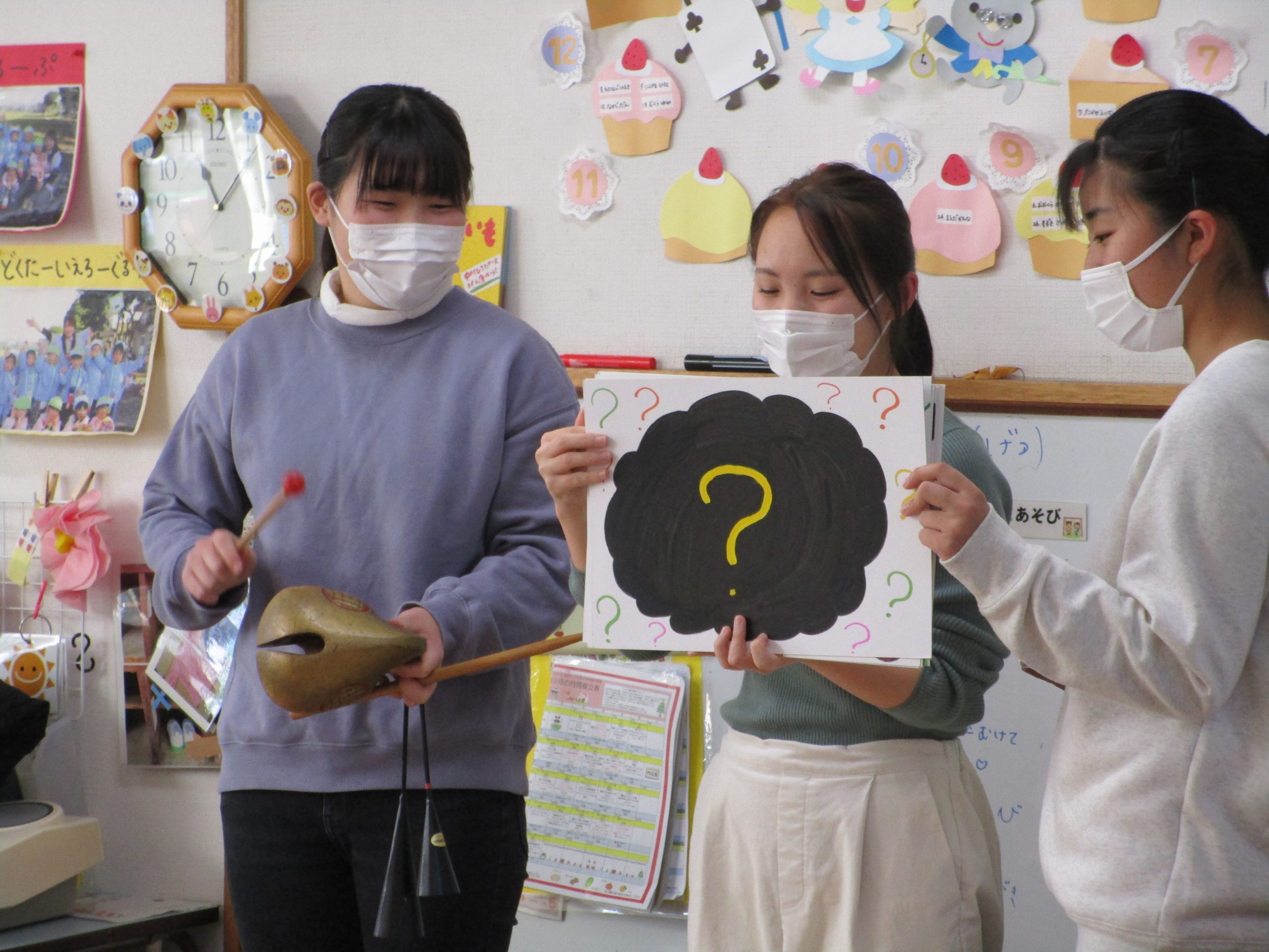 音楽紙芝居 2020 12/07 ニュース 今日は,茨城女子短期大学 保育科 2年生のお姉さん先生が,音楽紙芝居を見せてくれました。 手作りの紙芝居にいろいろな楽器で効果音をつけて,楽しくお話しをてくれました。 お話に合わせた音があることで,いつもより更にお話の世界に引き込まれていました。 素敵な音色や珍しい楽器に,子どもたちも興味津々でした。 ニュース URLをコピーしました! 今日の給食 12月7日(月) 欠席状況(感染症)12月8日(火) コメント コメントする コメントをキャンセルコメント ※ 名前 ※ メール ※ サイト 次回のコメントで使用するためブラウザーに自分の名前、メールアドレス、サイトを保存する。 上に表示された文字を入力してください。 Δ