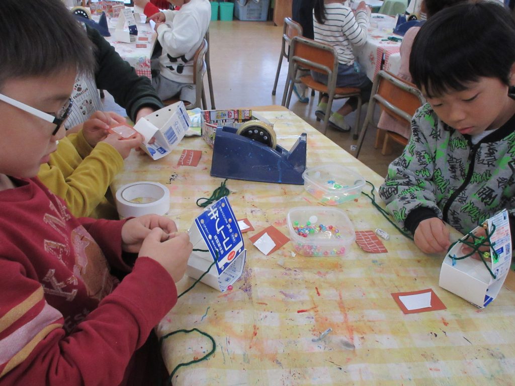 ツリー形の牛乳パックに開けた穴に,毛糸を通して作りました。難しい作業でしたが,真剣に取り組んで無事完成させることが出来ました!
