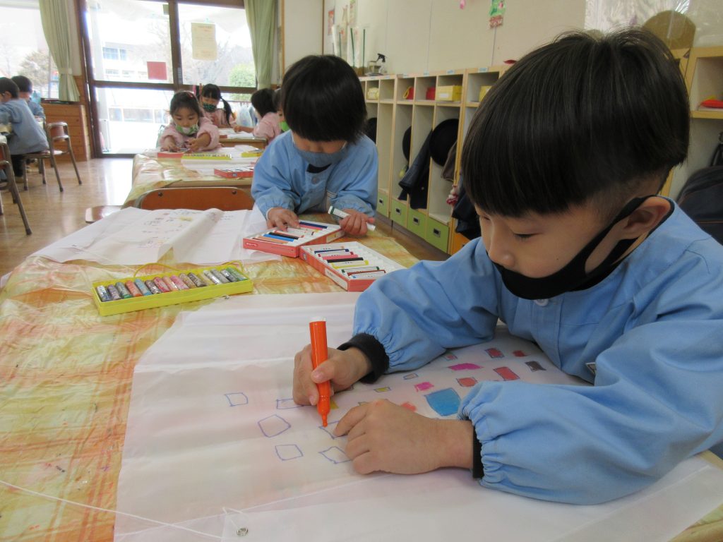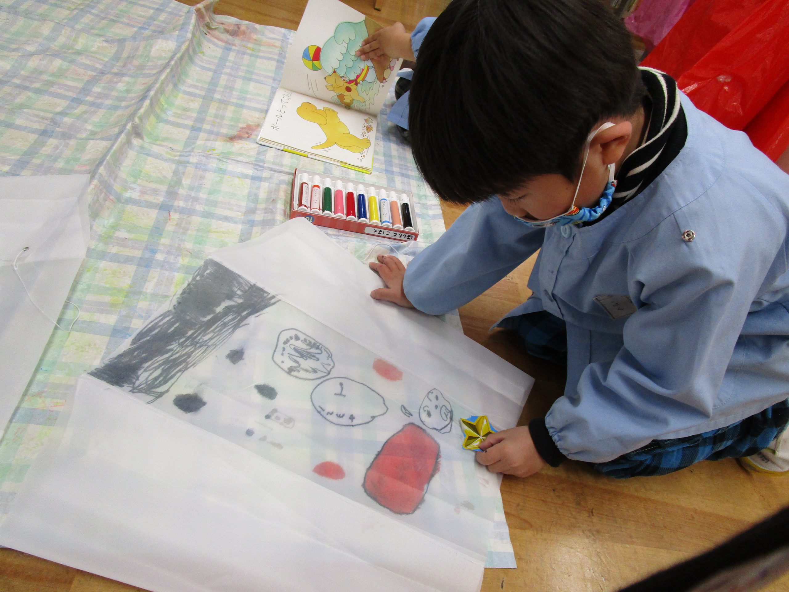 まずは,マーカーぺんかクレヨンの好きな方を選んで大きなたこに絵を描きました。