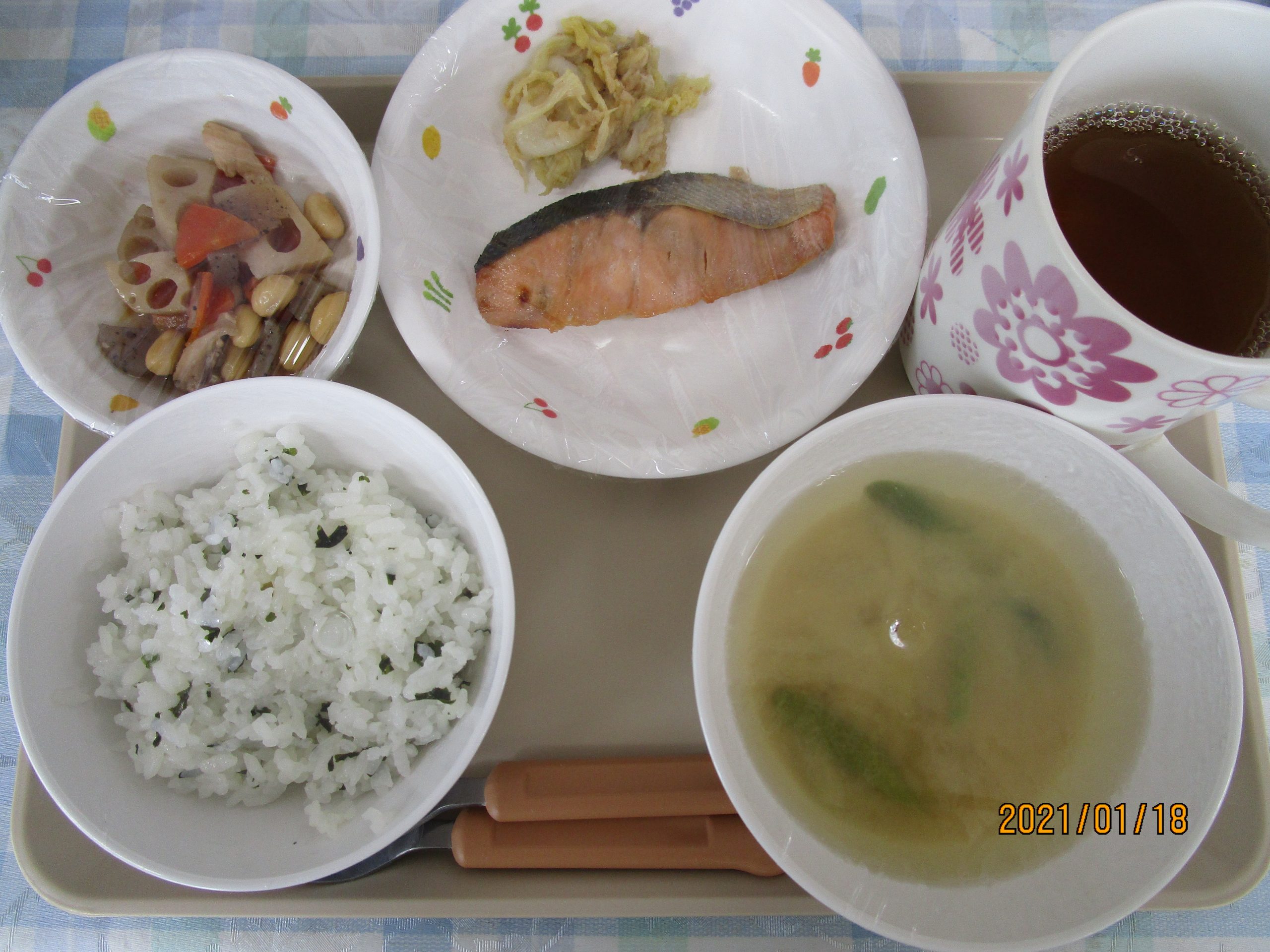 今日の給食 1月18日(月) 2021 1/18 給食 本日の献立 わかめごはん・鮭の照焼き・白菜のおかか和え・鶏肉と大豆の煮物・みそ汁(いんげん・玉ねぎ・さつまいも) 給食 URLをコピーしました! 今日の給食 1月15日(金) 今日の給食 1月19日(火) コメント コメントする コメントをキャンセルコメント ※ 名前 ※ メール ※ サイト 次回のコメントで使用するためブラウザーに自分の名前、メールアドレス、サイトを保存する。 上に表示された文字を入力してください。 Δ