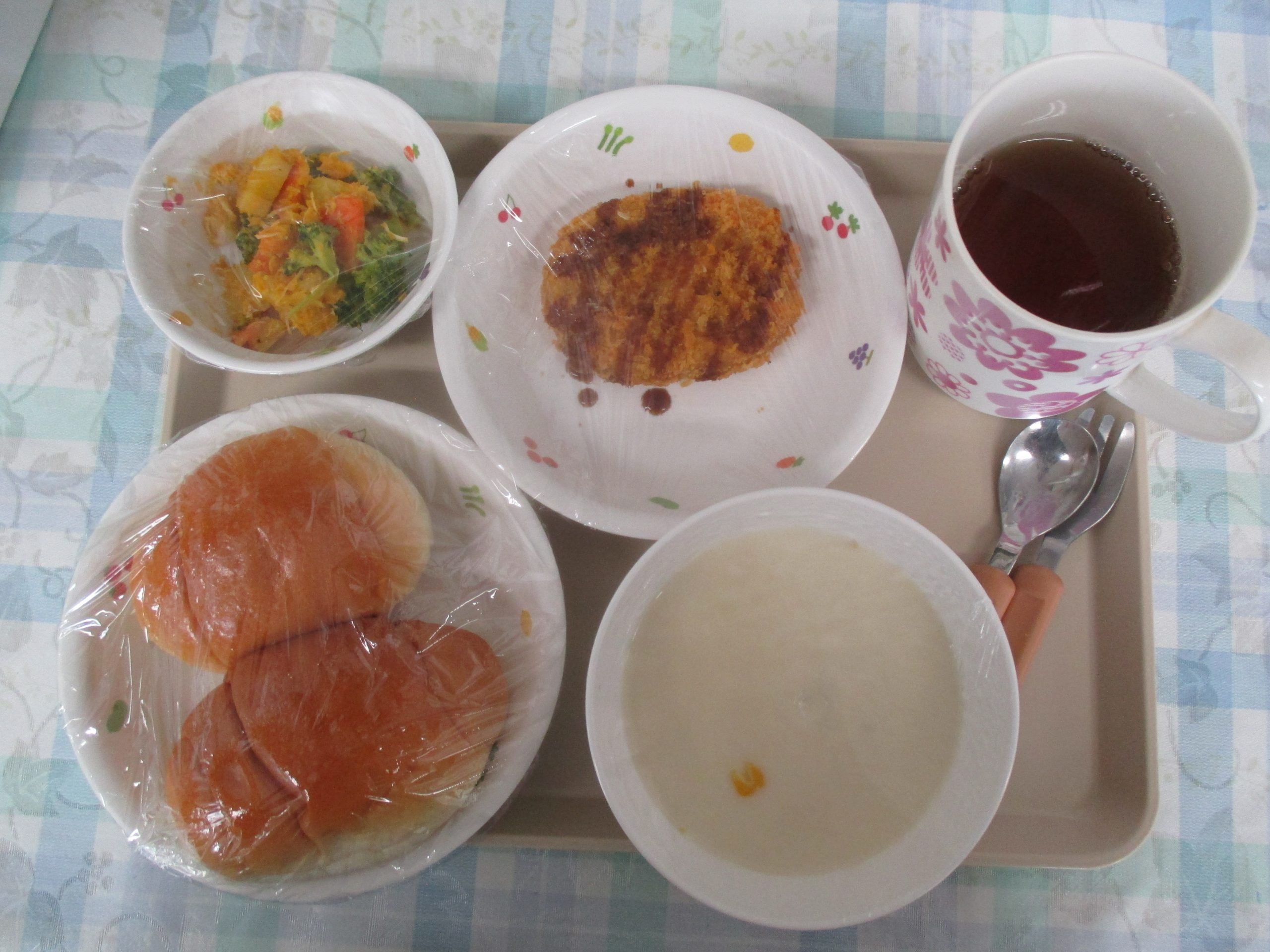 バターロール,コロッケ,蒸し野菜とチキンのサラダ,豆乳コーンスープ(コーン・玉ねぎ)