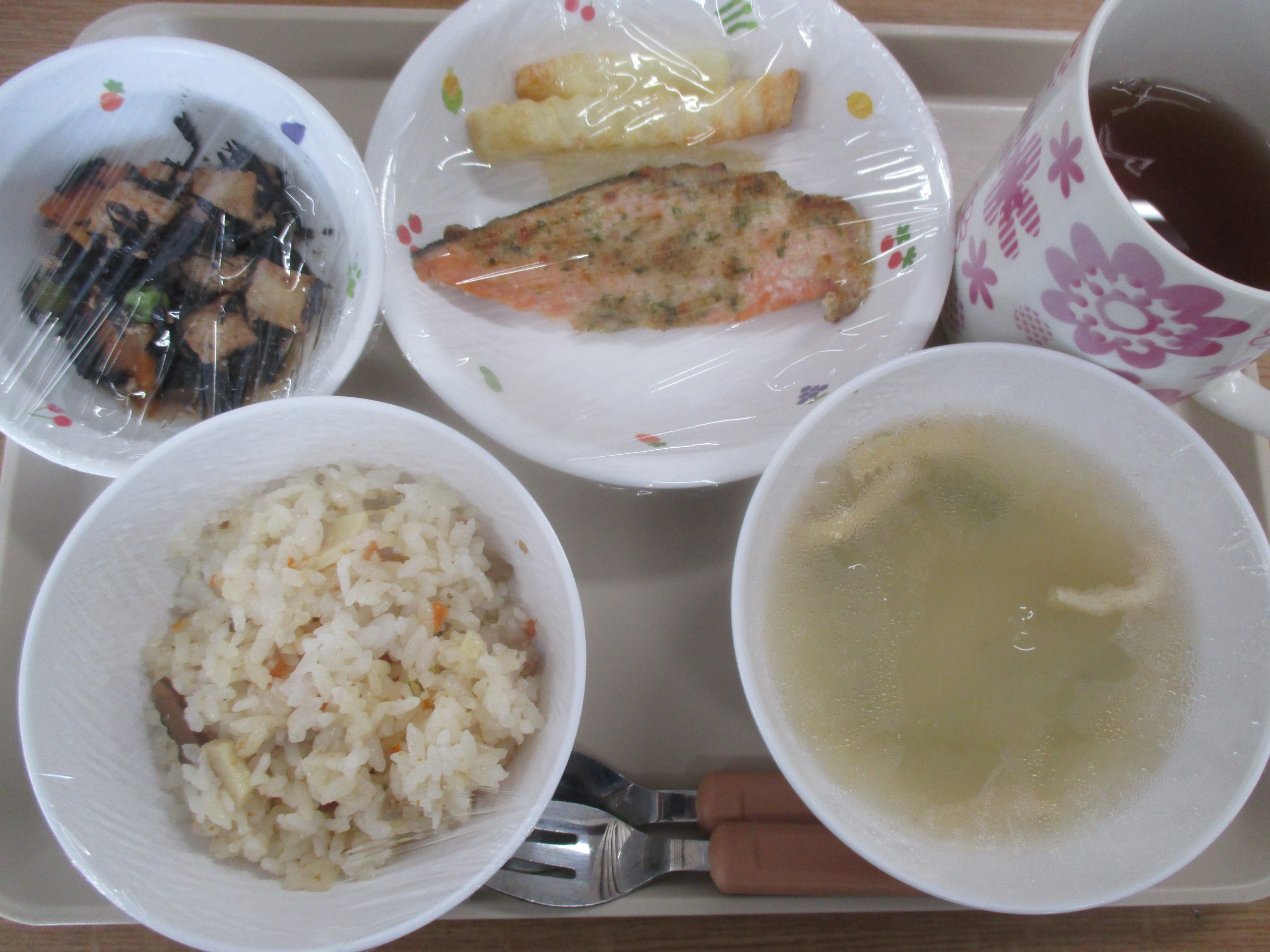 たけのこごはん,サケの磯マヨネーズ焼き,フライドポテト,厚揚げとひじきのそぼろ煮,みそ汁(大根・大根の葉・油揚げ)