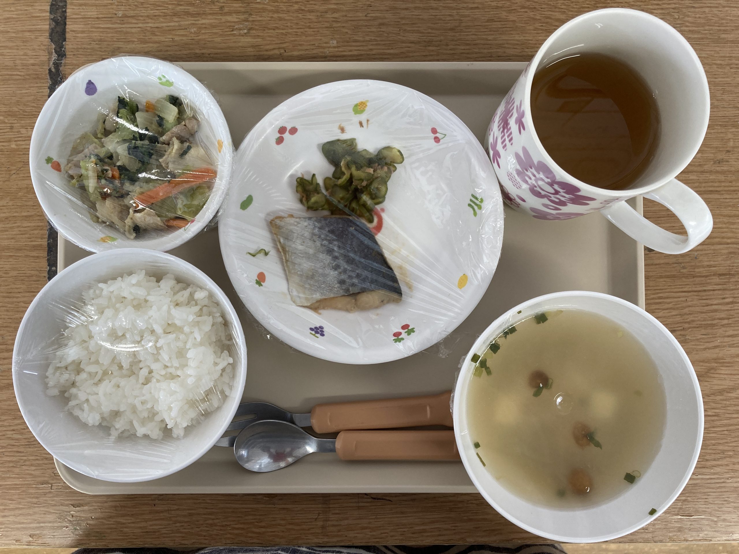 ごはん,さわらのレモンしょうゆ焼き,きゅうりのおかか和え.豚肉とチンゲン菜のみそ炒め,みそ汁(とうふ・なめこ・小ねぎ)