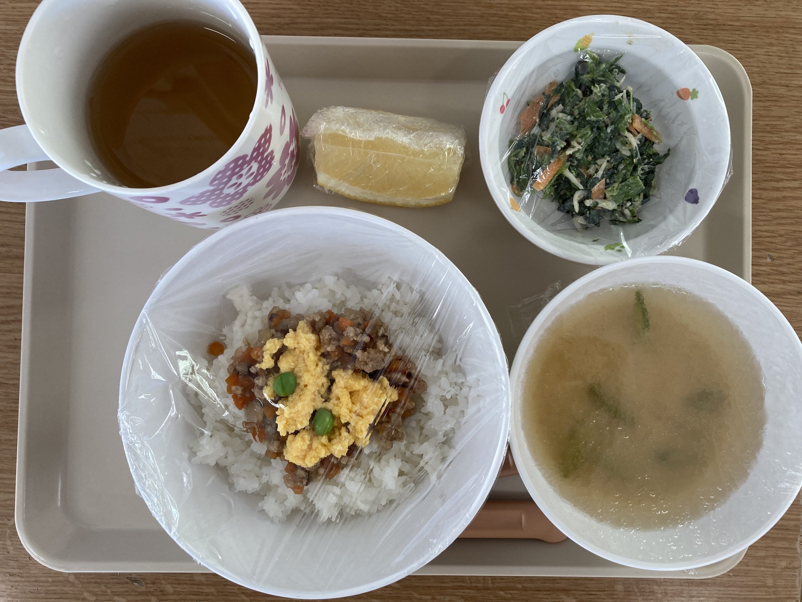 今日の給食 10月6日(水) 2021 10/06 給食 本日の献立 五目そぼろ丼,ほうれん草としらすのごまマヨ和え,グレープフルーツ,みそ汁(きぬさや・じゃがいも・たまねぎ) 給食 URLをコピーしました! 今日の給食 10月5日(火) 預り保育