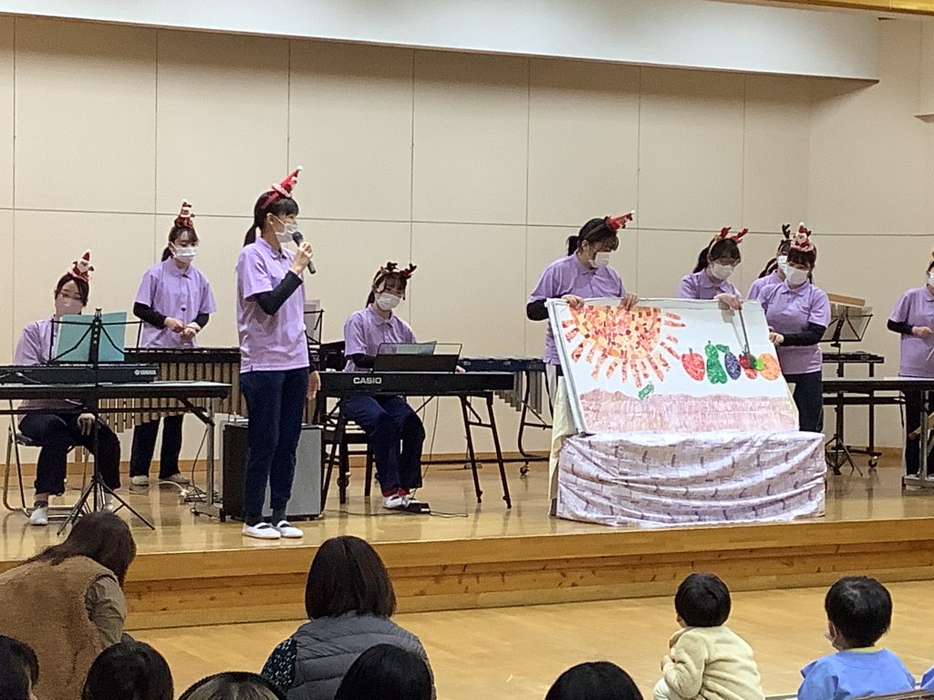 『ぽぽ』に参加している未就学児,そして幼稚園の1歳から5歳までの子どもたちに,短大のおねえさんたちが,手遊びをしたり,音楽紙芝居『はらぺこあおむし』を見せてくれたりして,とても楽しい時間を過ごすことができました。