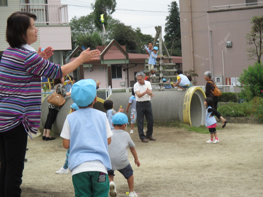 年長組のみんなは、お家の方々の手を引いてとても嬉しそうに、「こっちだよ!」「ウサギもいるから、来て〜♪」と、幼稚園を案内していました。