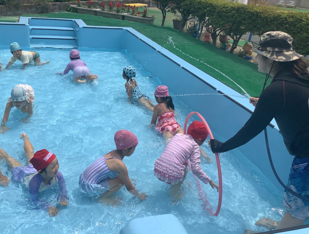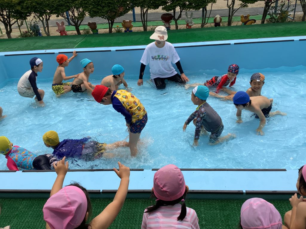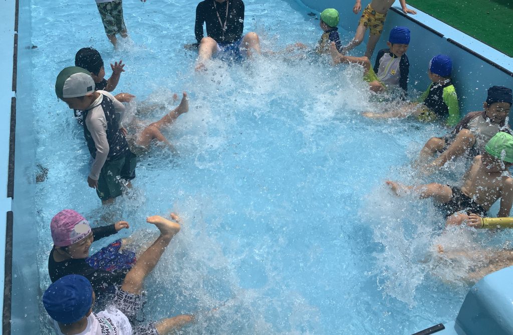 気温が上がり,プール日和になったので,5歳児の子どもたちが今年度初めてのプール活動を行いました。